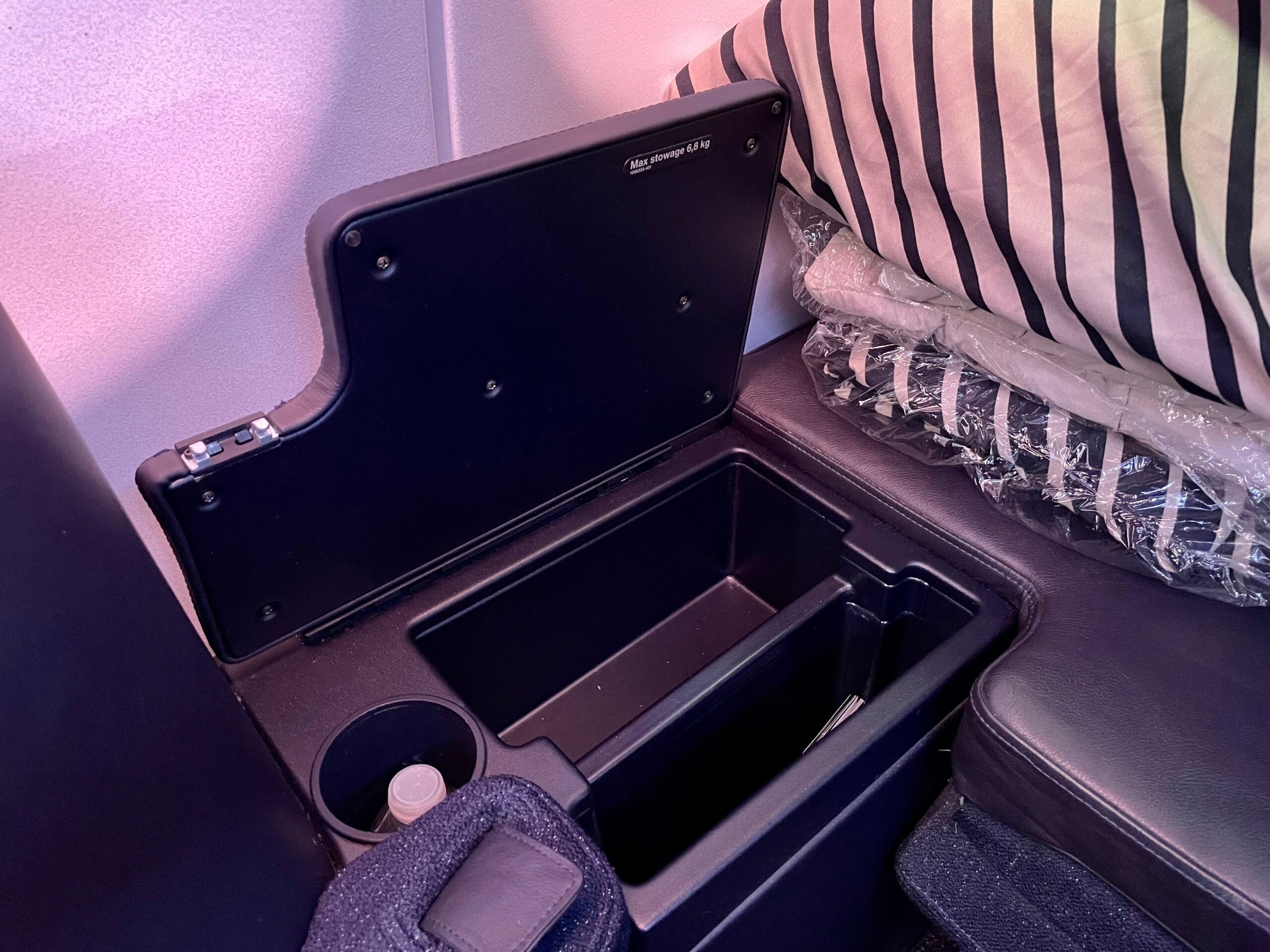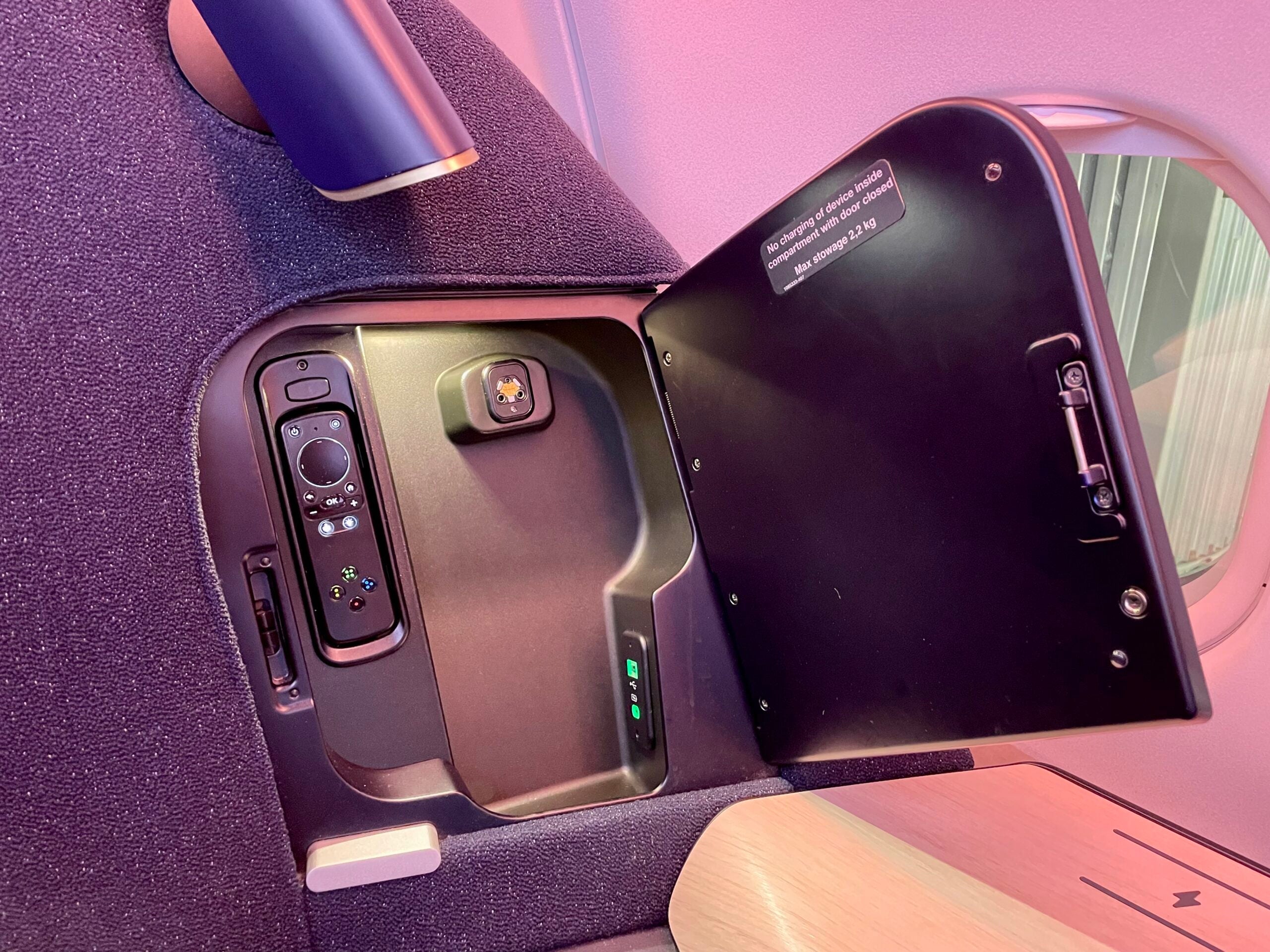 This is something we are increasingly seeing in hotels and lounges but not so much inflight — a wireless charging pad, with this one incorporated into the seat's side table, which sits opposite the aisle. This can be convenient as you don't need to unpack (and potentially forget) your charging cords. Just make sure to remove your phone's case if it is thick (as I had to) so the signal can reach your device.