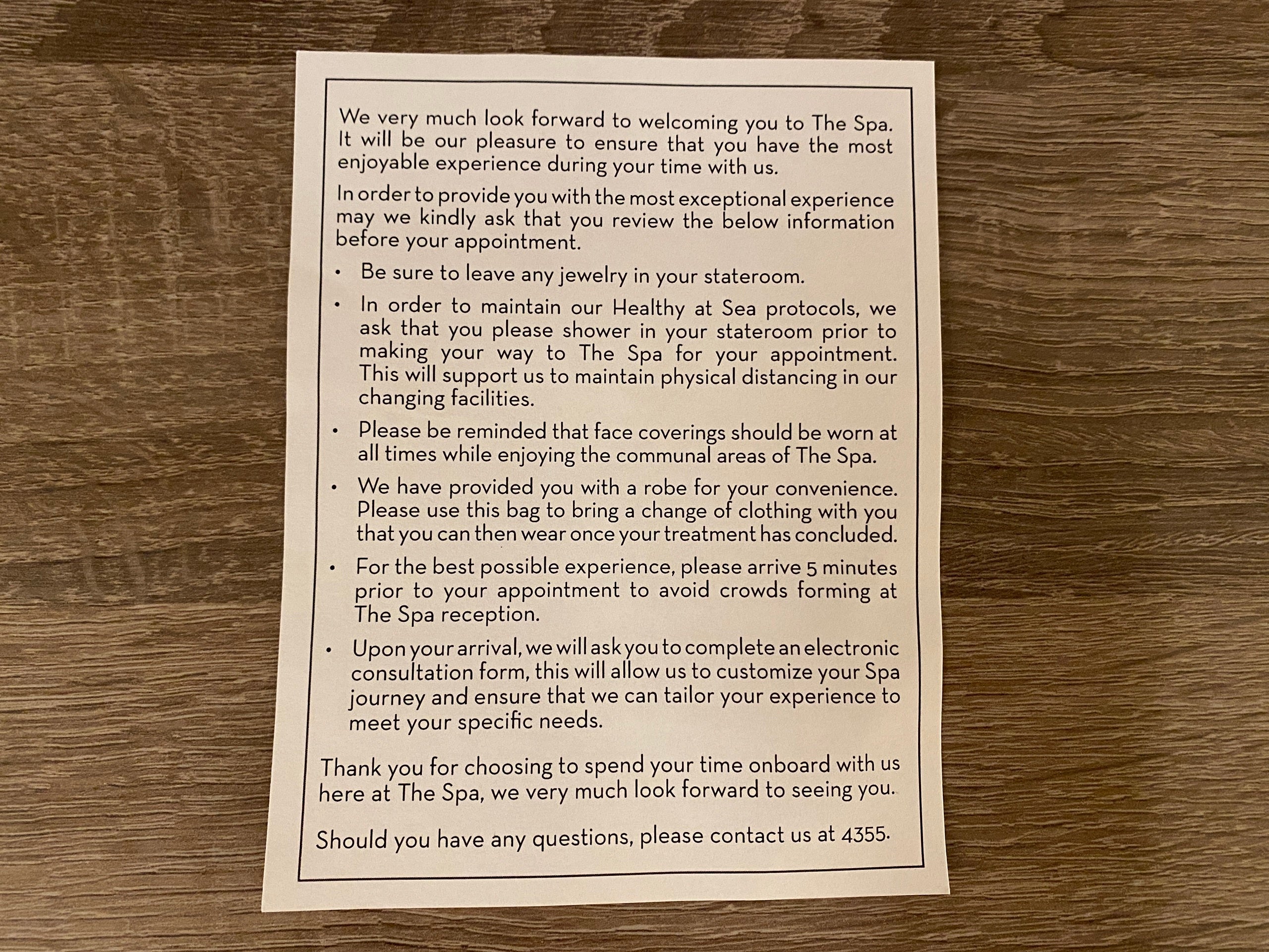 Further, certain tweaks have been made to ensure less traffic in public areas, such as the fitness center and spa. A temporary policy now requires passengers wishing to work out to make appointments to do so. And, if you have a spa treatment, expect that a robe will be delivered to your cabin for you to change into before you go, eliminating pre-treatment crowding in the changing rooms.