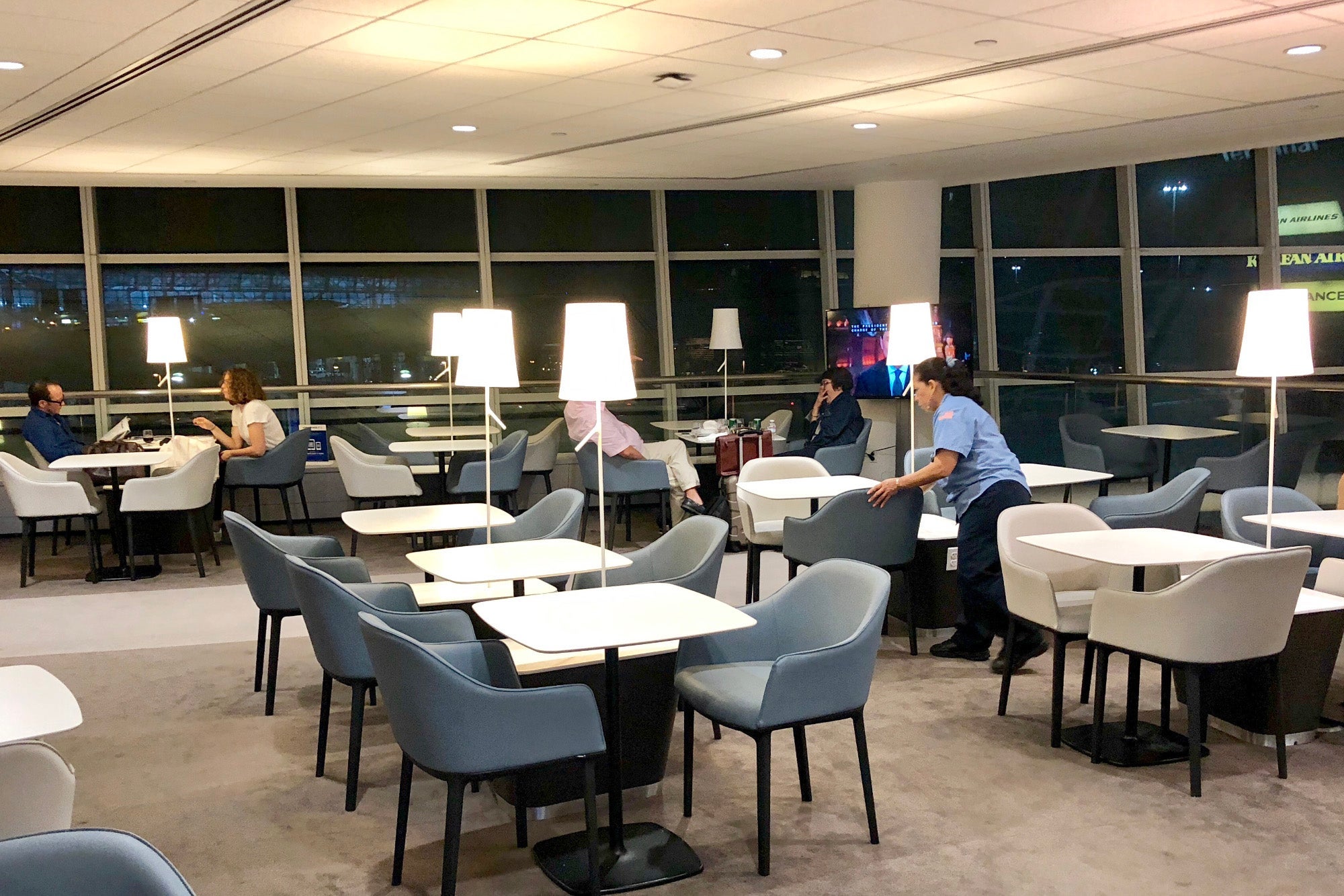 But when I arrived at the Air France lounge in T1, there was a large crowd gathered around the one check-in agent, waiting impatiently to be allowed in. I realized that this was in large part due to the fact that the lounge also participates in the Priority Pass program — in this case, Priority Pass members were allowed to enter the bottom floor of the lounge, while the top level was reserved for Air France premium passengers. (The JFK lounge, along with the one in Chicago, is the only one that's currently open during the COVID-19 crisis, Air France warns. Many airline lounges in the U.S. are closed.)