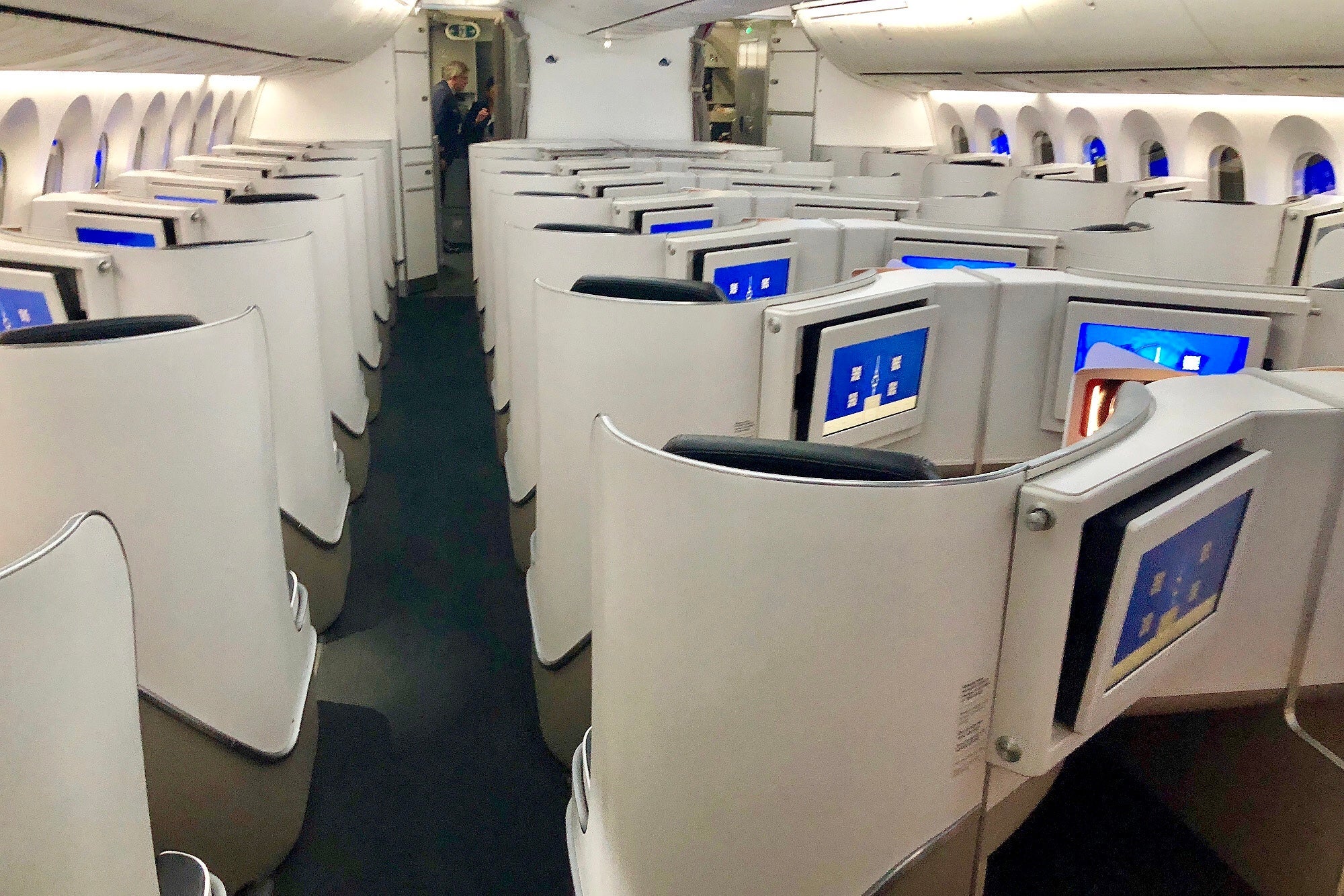 Air France's 787-9's feature three classes of service: business, premium economy and economy. The business-class cabin stretches from rows 1-8 and consists of a total of 30 lie-flat seats in a 1-2-1 reverse-herringbone configuration.
