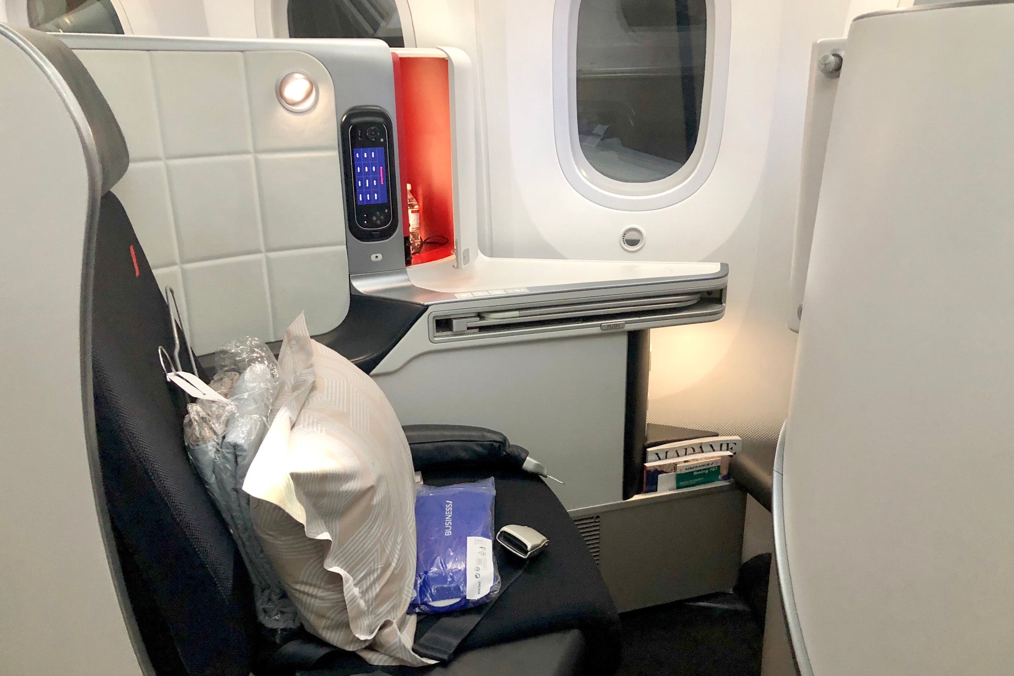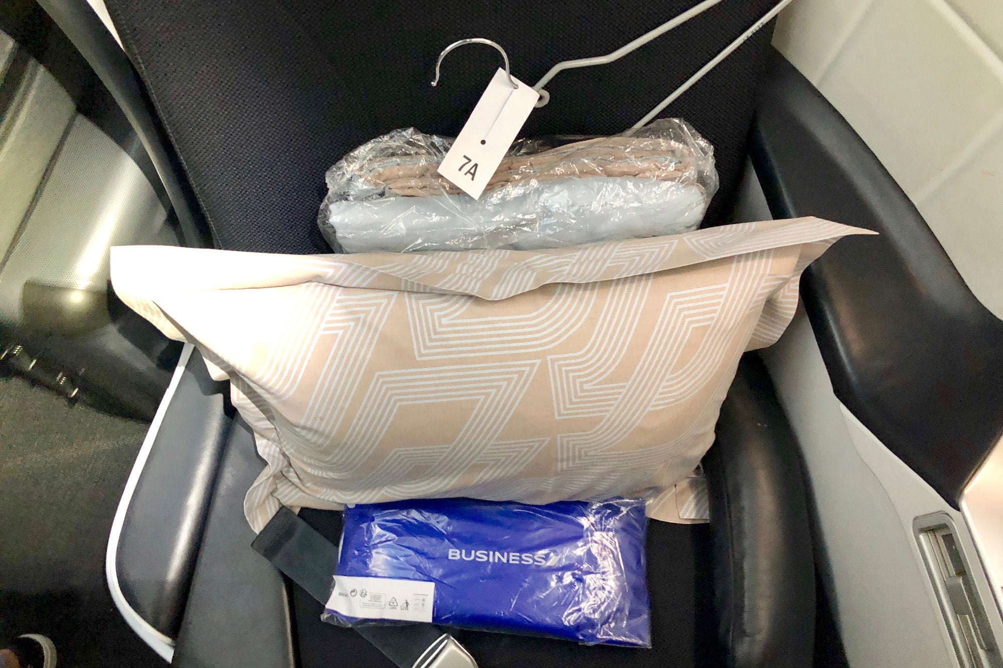 When I arrived at my seat, I found a hanger, blanket, pillow and pair of slippers at my seat. The pillow was a great size and felt wholly adequate for sleeping — it's on the rare side for an airline to get the pillow right. The blanket was soft but thick — luckily the cabin was cold, or else I would have been uncomfortably warm during the flight.