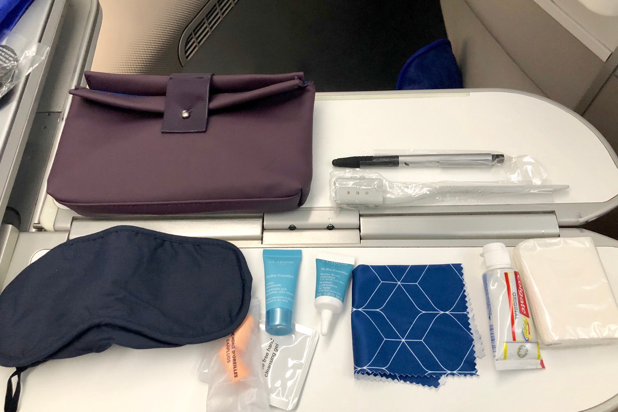 Air France provided an airline-branded plum-colored amenity kit that contained all the basics including an eye mask, toothbrush, toothpaste, tissues, ear plugs, a pen, microfiber cloth and moisturizer and lip balm from Clarins Paris. The Clarins products and eye mask were great, but I wasn't a huge fan of the kit itself, so I left it on board.