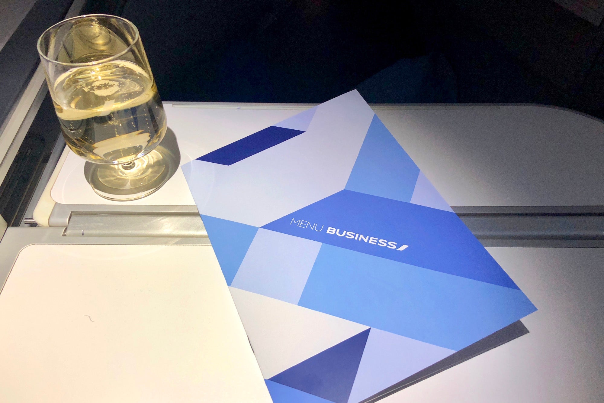 Cabin service started with a choice of orange juice or water — no alcohol was offered on the ground in New York. The meal service started promptly after we reached cruising altitude, which I appreciated since I was desperate to sleep at this point. First, a flight attendant came and asked what I'd like to drink and gave me my dinner menu. I asked for a glass of Champagne — on board Air France served Deutz Brut Classic, which retails for about $50 on the ground.