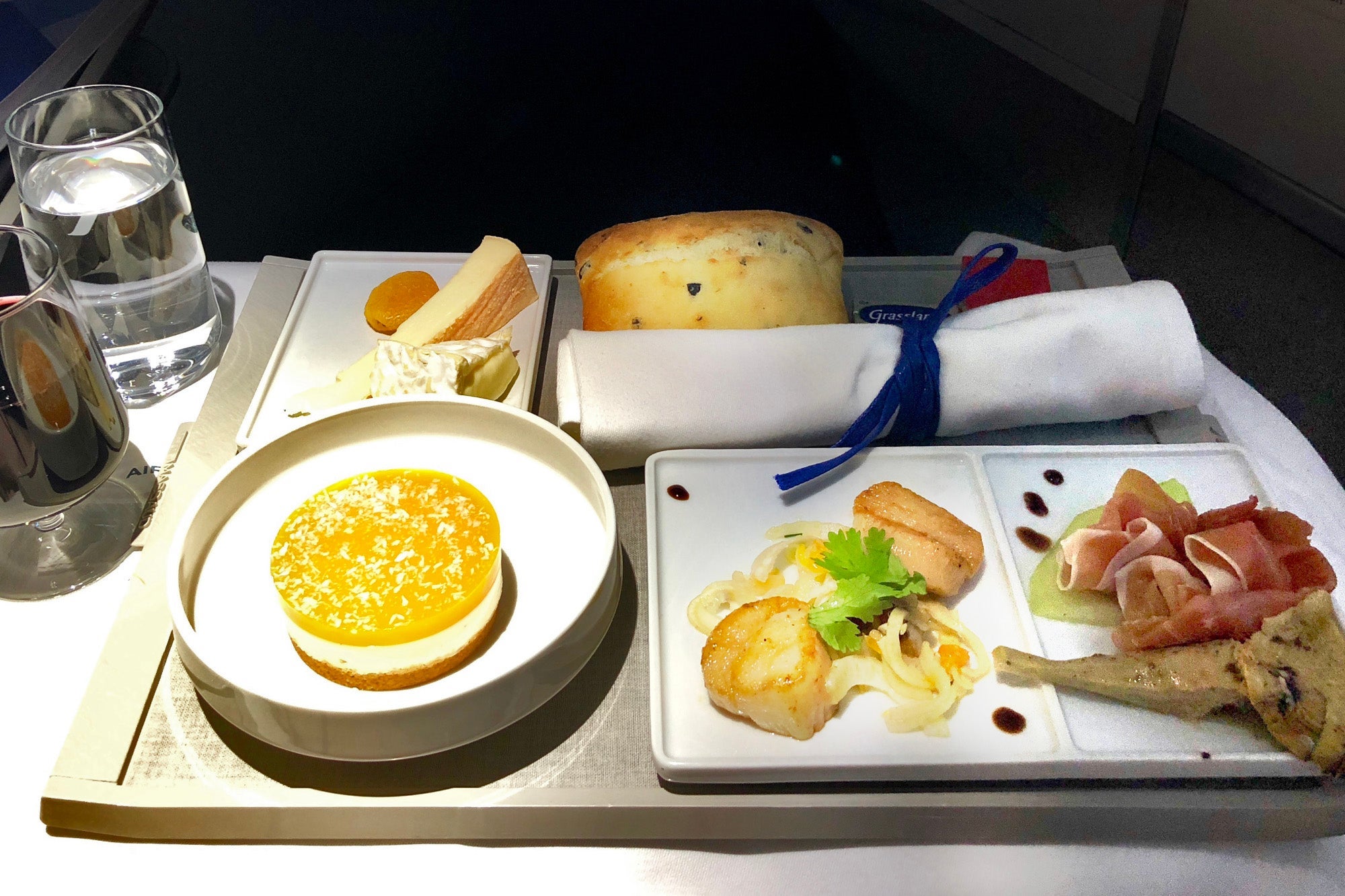 Dinner service was quick and efficient, which I really appreciated given the late departure. I liked how dinner was served on one tray at one time, with only the appetizer plate being swapped out for the main course. In other circumstances, this may seem rushed and more akin to a dinner service in premium economy, but it's exactly what I wanted at 1:30am.