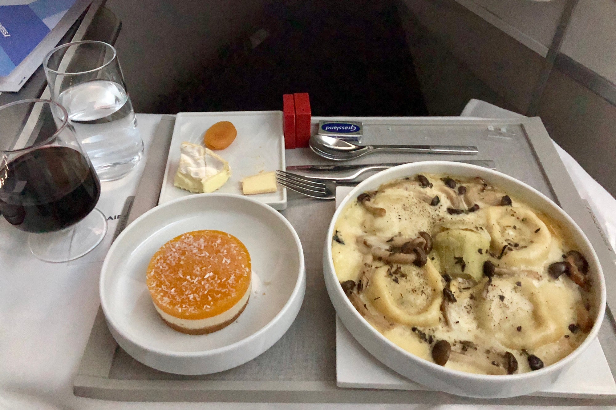 I wavered between the chicken and the ravioli but settled on the ravioli — I was going to Italy, after all. Once I gave the flight attendant my order, she returned a few moments later with a tray that had the appetizer course (pan-seared scallops on top of fennel and orange salad, Parma ham, melon and grilled artichokes), cheeses, bread and dessert on it. The scallops were delicious. And you can't go wrong with a ham and melon salad, either.