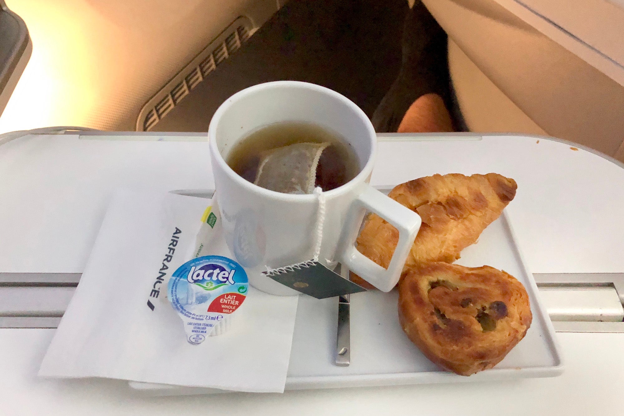 When the FA was clearing my tray after dinner, she asked if I wanted to be woken up for breakfast, or if I wanted to sleep — I told her that I would skip breakfast in order to sleep more. Once I did wake up just a few short hours later, I had just enough time for the express breakfast, which was actually perfect — a cup of tea to help nurse my cold and two croissants because, well, France.