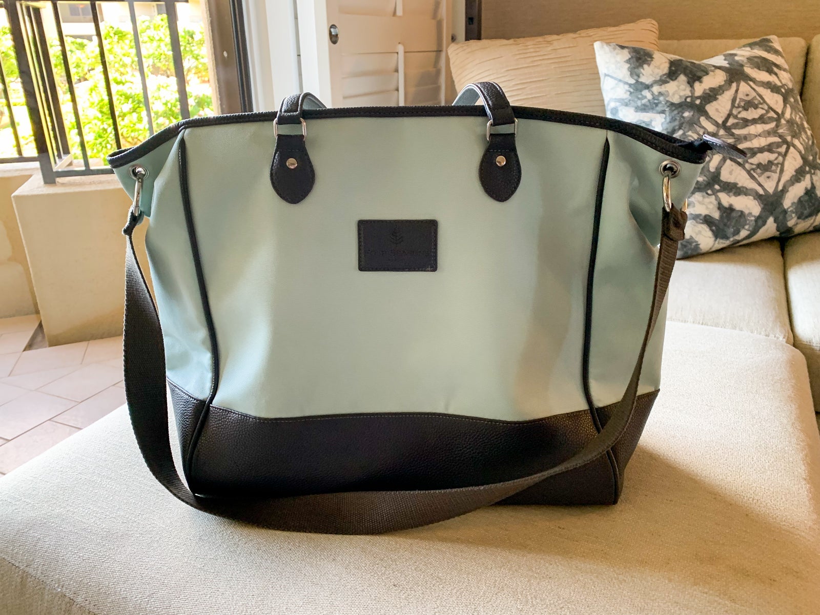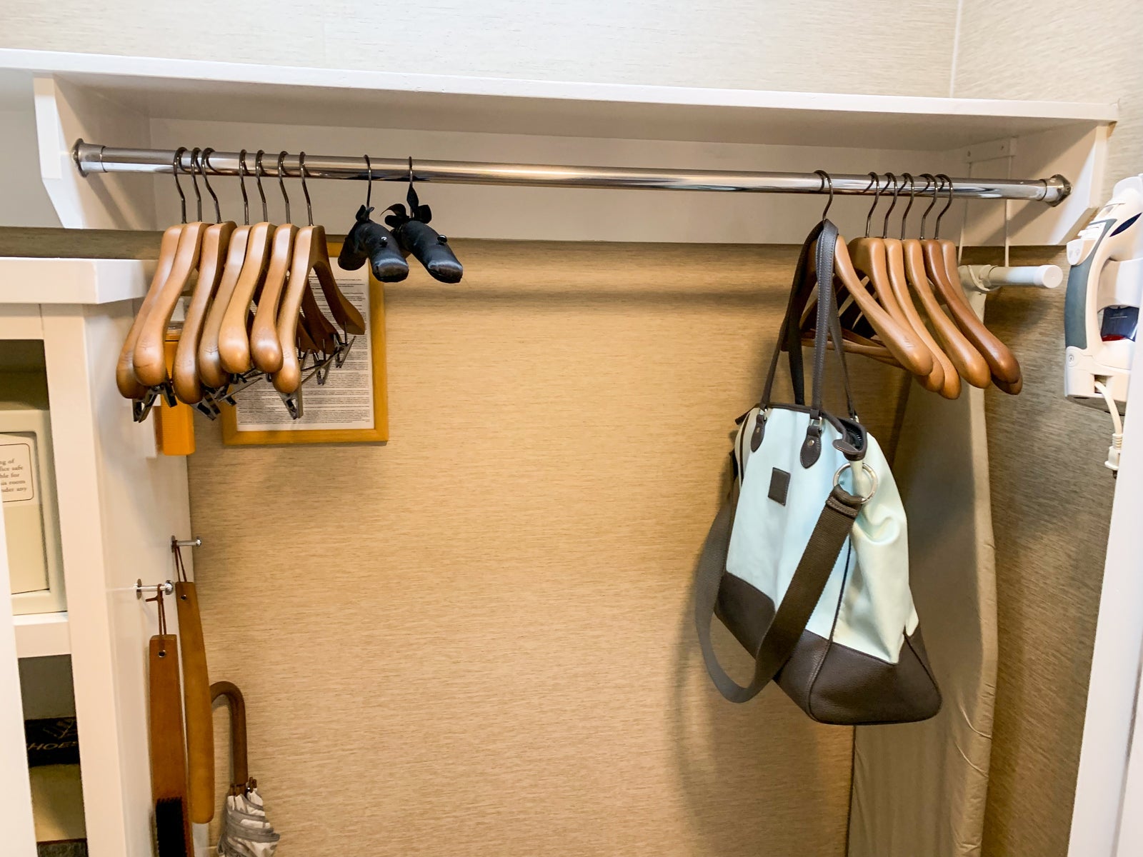 Near the entrance of the room was the large closet with plenty of hangers and safe. There was also a baby-blue beach bag hanging in the closet.