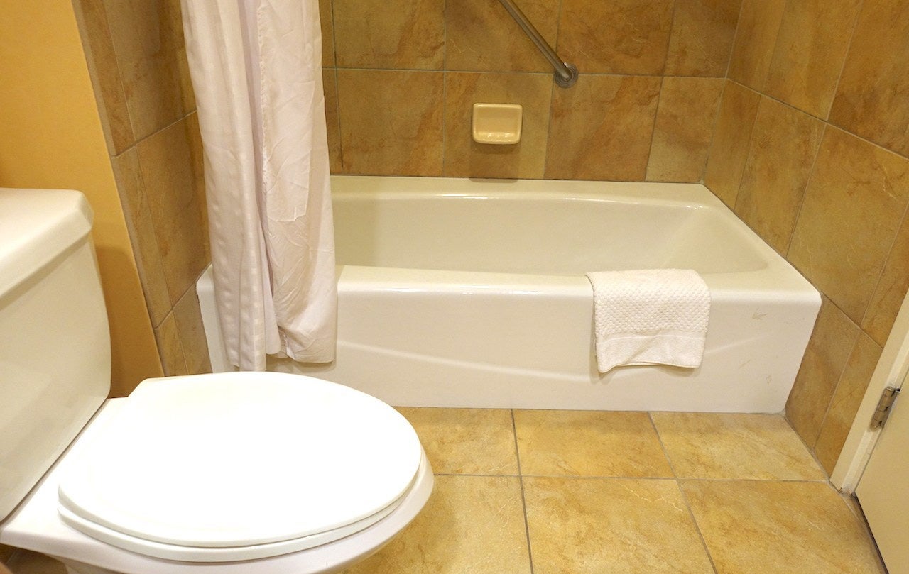 The shower curtain was stained and too short for the length of the rod, and the tub was very shallow. No relaxing soaking baths here.