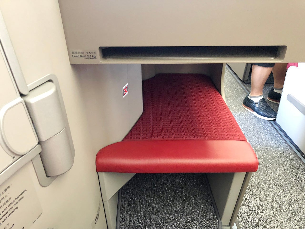 Other than the lack of privacy, I found the seat to be comfortable. Below the seatback in front was a small storage compartment, where I put one of my carry-on bags. This storage space was the only place where I saw any sign of wear and tear. The lining on the bin came loose every time I took the bag out or back, and it had loads of glue on it.