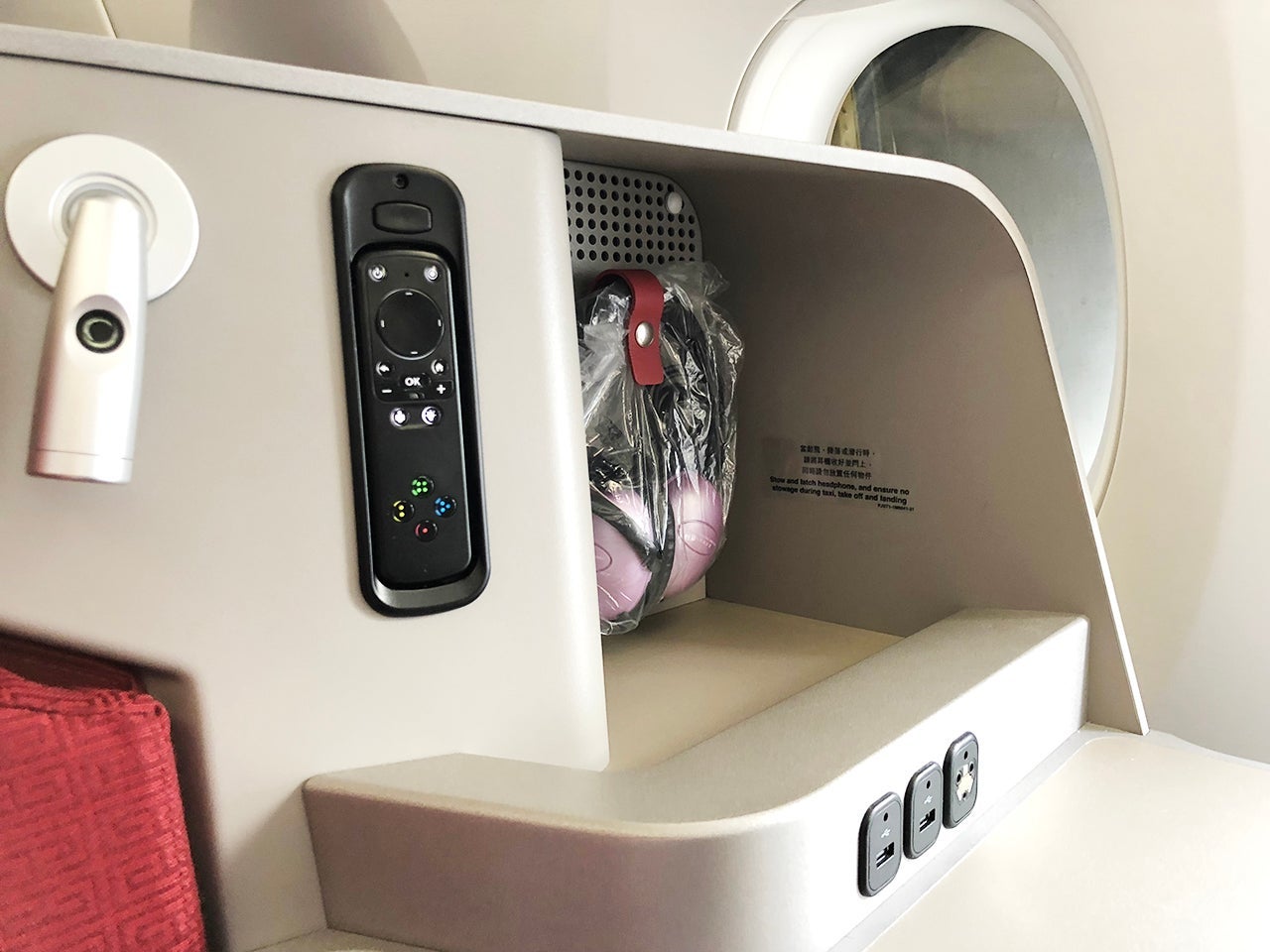 Each of the business-class seats had a small storage area to the side and above the table that contained a place to put the airline-provided headphones. Underneath the seatback entertainment screen was a small literature pocket, though it seemed too small to be of any use.