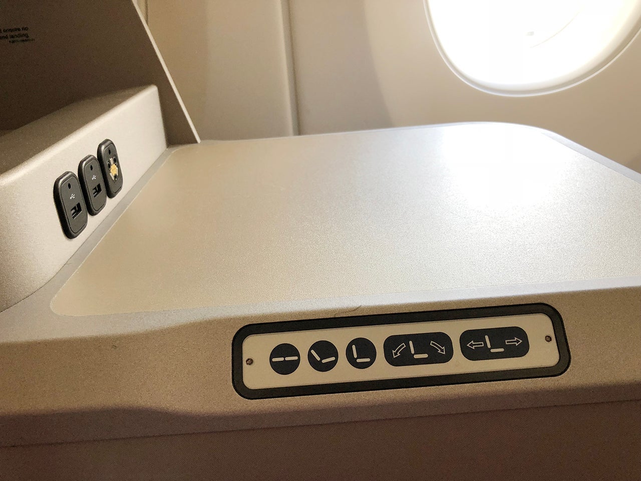 Each seat in the business-class cabin was equipped to provide plenty of power. Below the small storage space with the headphones were two USB ports and the headphone port. Below each seat was a power outlet.