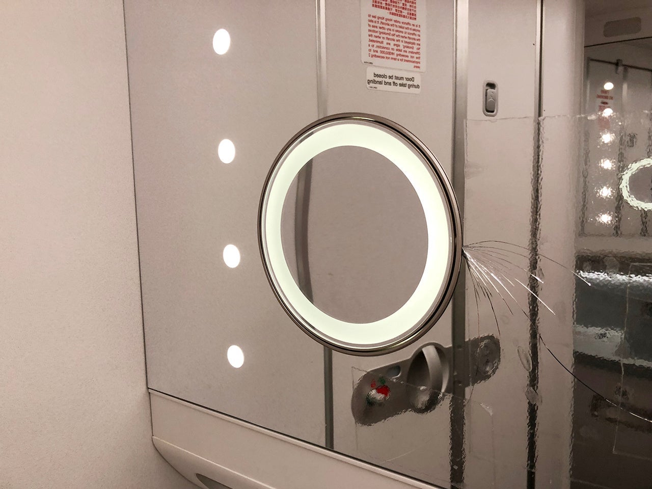 In one of the business-class restrooms, there was a gnarly crack in the mirror, which was taped up.