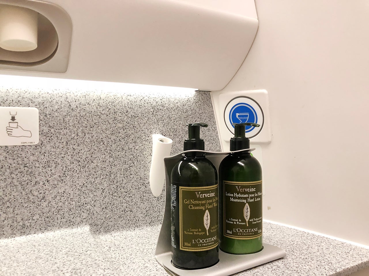There were eight lavatories, two of which were at the front of the aircraft for business-class passengers. The lavs were spacious and were stocked with L'Occitane hand wash and lotion.