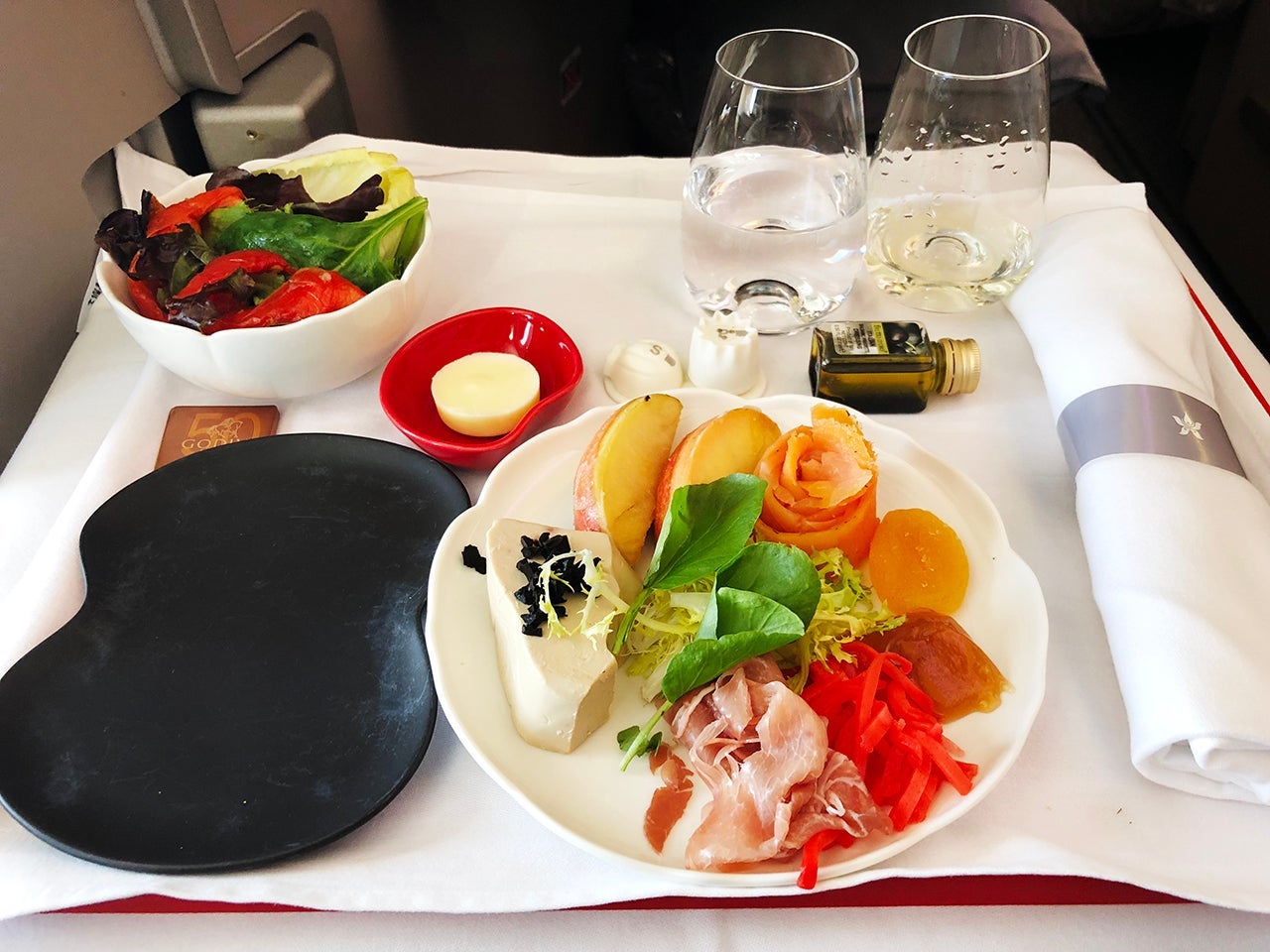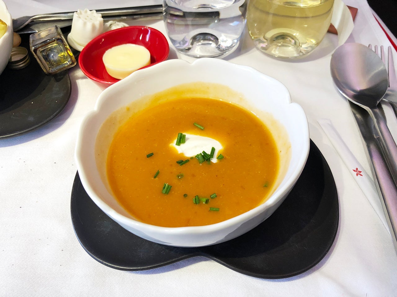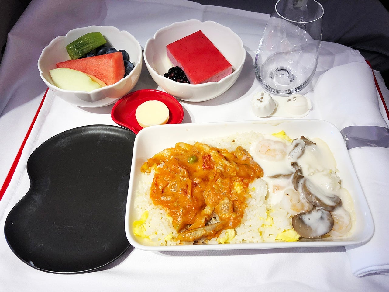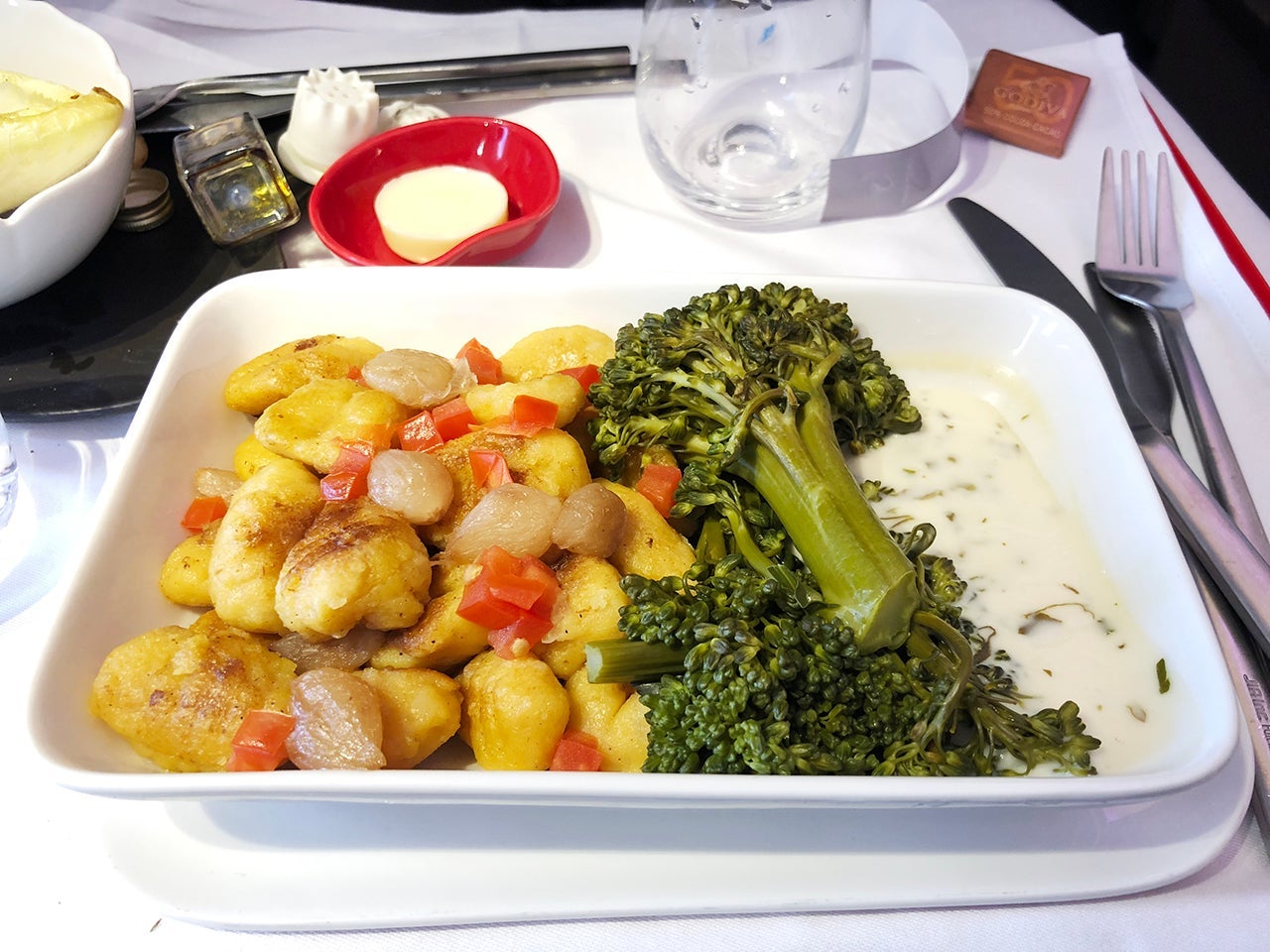 To round out lunch service, passengers could choose from seared arctic char with red quinoa, farro and roasted mixed vegetables; braised chicken with Chinese sausage and wood ear mushroom in oyster sauce, steamed rice and seasonal vegetables; and sautéed pumpkin gnocchi, pearl onions and tomato with creamy herb sauce and buttered broccolini.