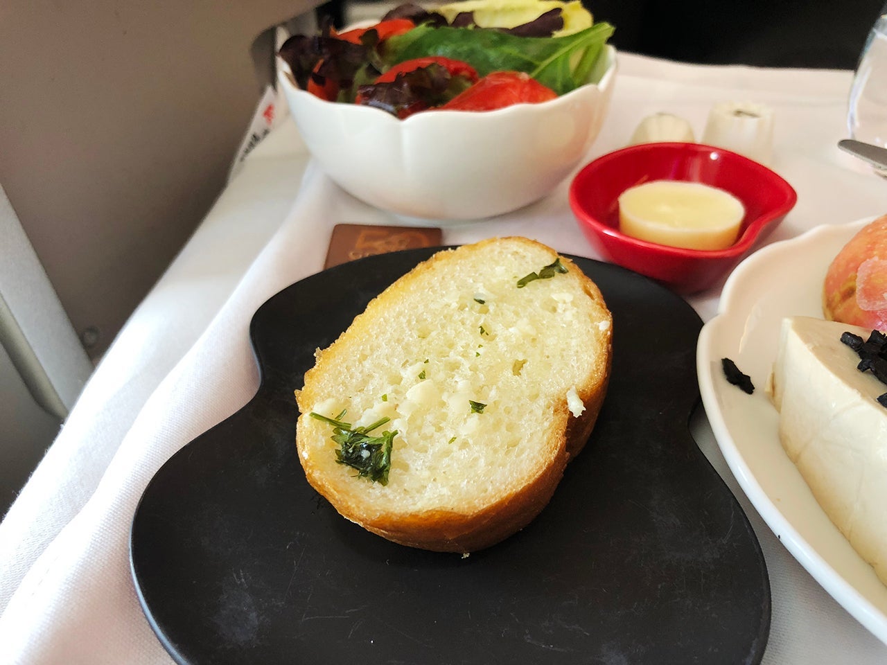 Hands down, my favorite food on the flight was the delicious garlic bread. Flight attendants came through the cabin several times to serve a selection of breads, and the only thing people took was the garlic bread.