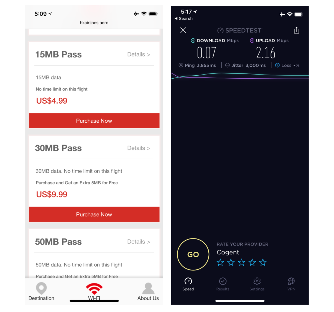 Hong Kong Airlines' A350s come equipped with Wi-Fi. On my flight, Wi-Fi prices ranged from 15 MB for($4.99 to 100 MB for $22.99. Unfortunately I found the speed to be dismal overall.