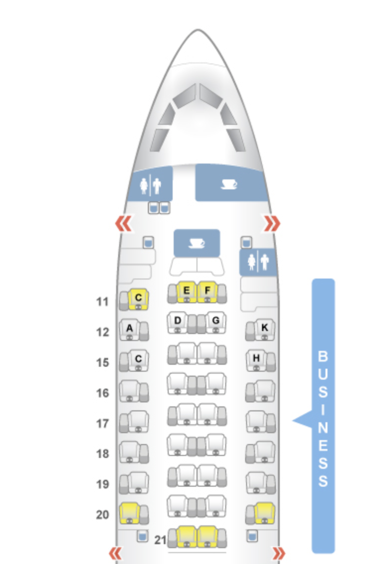 At the front of the aircraft was the business-class cabin. The cabin had seats in a 1-2-1 configuration, guaranteeing every passenger direct aisle access. Each of the seats featured 44 inches of pitch and 23 inches of width. On this flight, all 33 seats were occupied. The carrier assigned letters to the seats in a unique way — window seats in the odd-numbered rows, for example, were marked as "C" and "H," while the window seats in even-numbered rows were the more conventional "A" and "K." Though this method does make it easier to determine which seats are better than others — in this case, "A" seats are preferable to "C" seats, since the latter aren't protected from the aisle.
