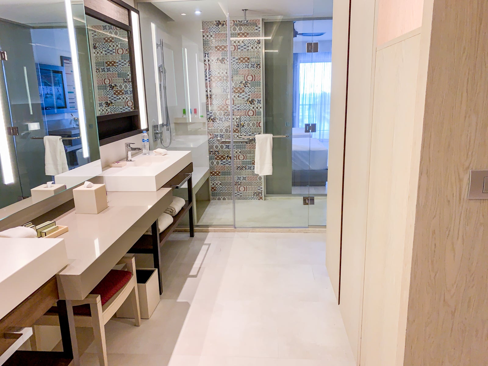 Walking in from the indoor-outdoor hallway, I immediately noticed how long the room was. And the bathroom to the left was massive. The bathroom was separated from the entry hallway with a smart closet system with doors accessible from both sides. There was a separate room for the toilet, dual vanities so two people could easily get ready at the same time and a glass shower that looked into the bedroom area. On the outside of the shower, sliding doors could be positioned to block the views from the living area into the shower and bathroom. (I'm not sure why these open-concept showers have become such a trend, but I've noticed them at other resorts as well.)