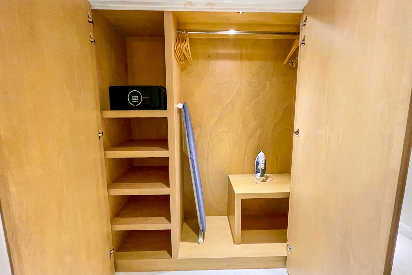 Across from the bathroom was a closet with plenty of hanging space, as well as some shelves for additional storage. For sanitary reasons, it was stocked with the bare minimum: hangers, a safe and an iron and ironing board. The hotel was happy to bring me slippers when I requested them.