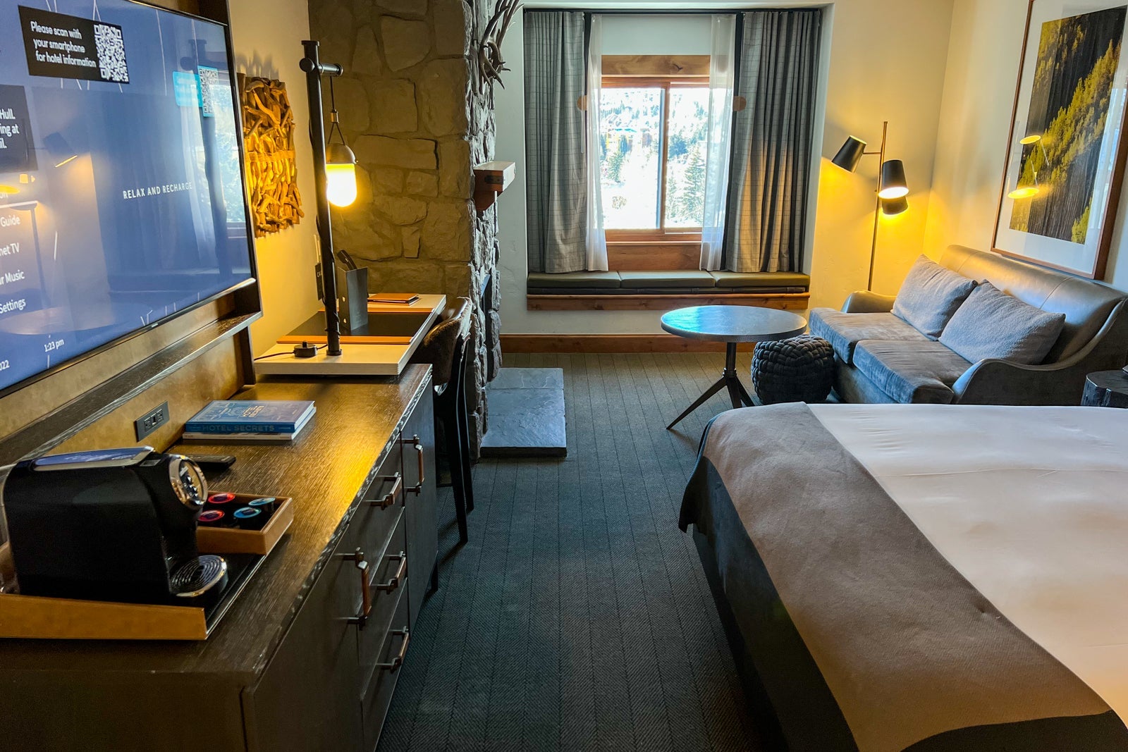 My upgraded room featured a mix of modern and rustic elements, including wooden window trim, metal light fixtures, a sleek leather-upholstered headboard and a stone fireplace with antlers mounted above the mantel. It offered ample space and amenities for one person, but if I was traveling with multiple people, this room would not have been large enough to accommodate everyone and their ski gear.