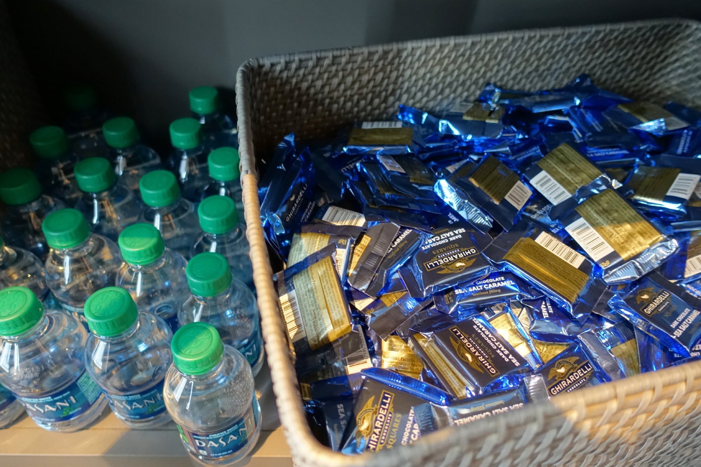 There are Saks pillows and blankets available — the same ones you'll find on the plane — plus water bottles, chocolates and other amenities.