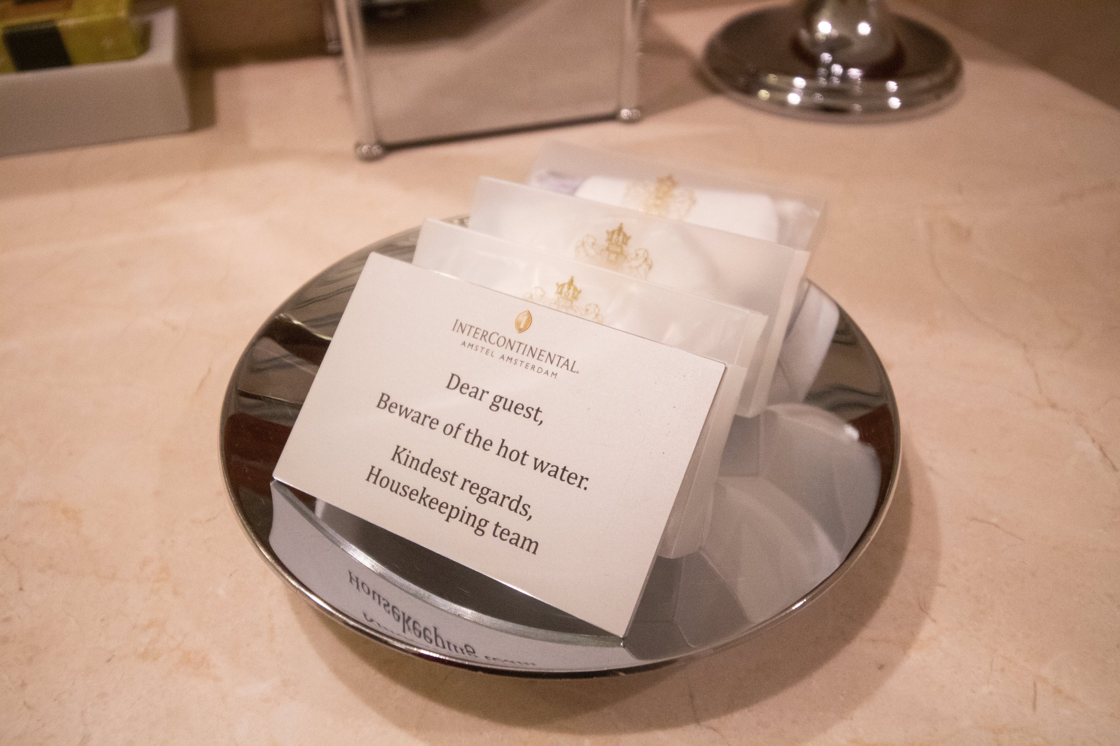 A note that warned guests of the hot water was next to the sink. The warning was warranted, considering the water turned hot within seconds. Like, really hot. You didn't have to worry about taking a cold shower here.