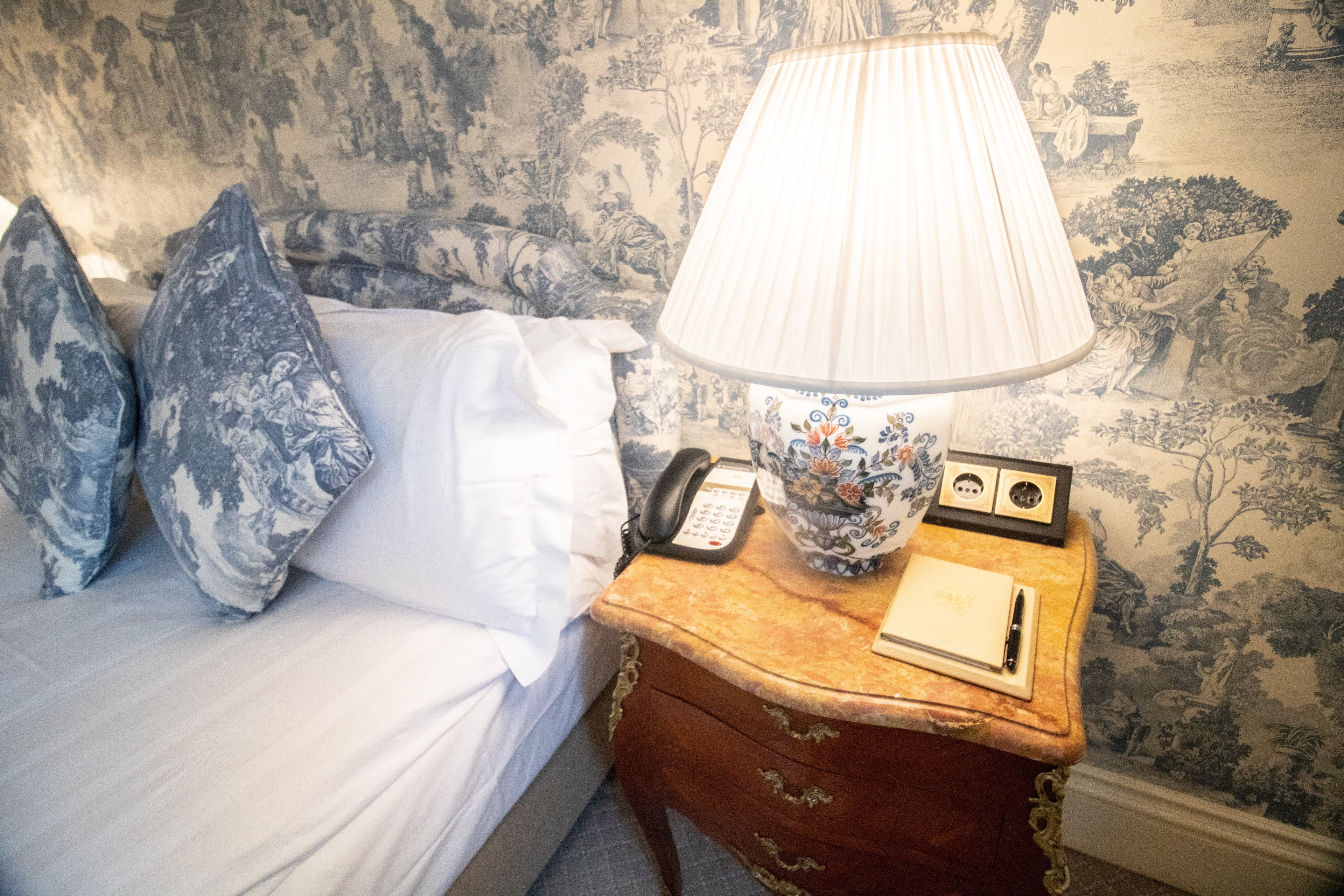 The detailed wallpaper and bedding were inspired by the Toile de Jouy motifs, which were designed "to show the lives of past times as a protest against the monarchy leading up to the French Revolution." (Don't be too impressed with my art-history knowledge. I read that on an info card in the lobby.)