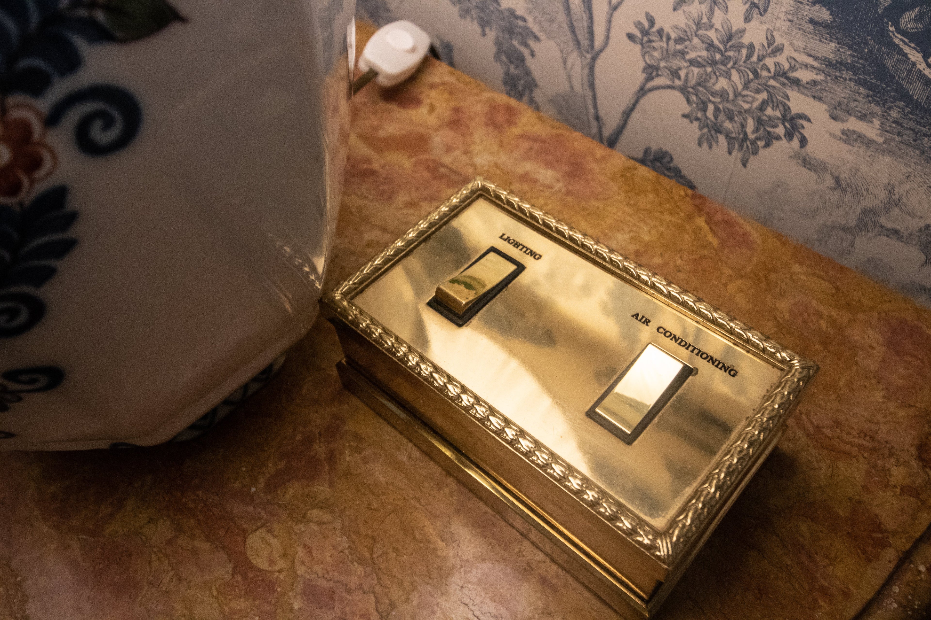 The other end table didn't have any outlets that would allow me to charge my phone while lying in bed. Instead, it had a control switch for the lights and air conditioning.
