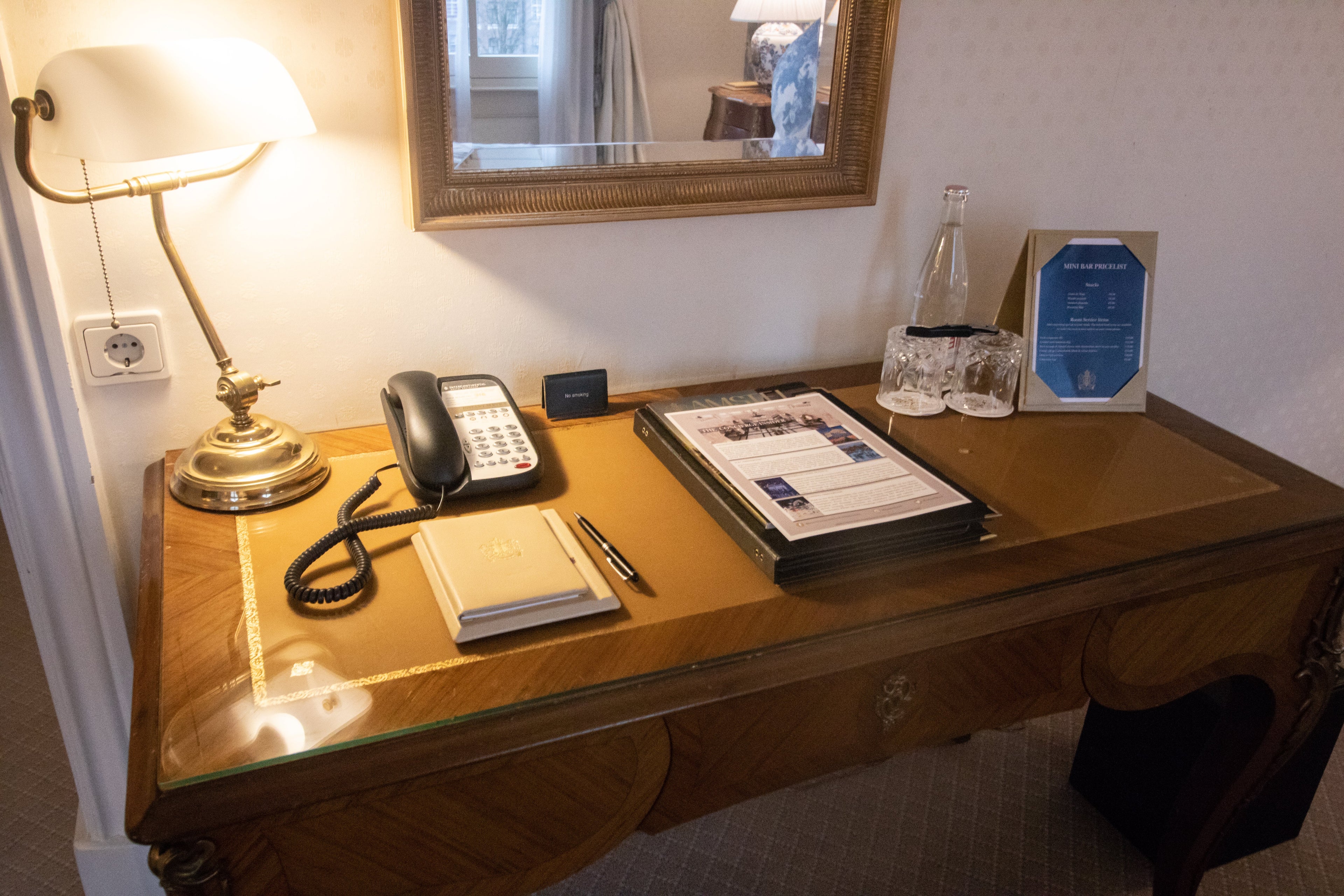 On top of the desk, there was a phone, pad and pen, room-service menu, minibar menu and a complimentary bottle of Evian water.