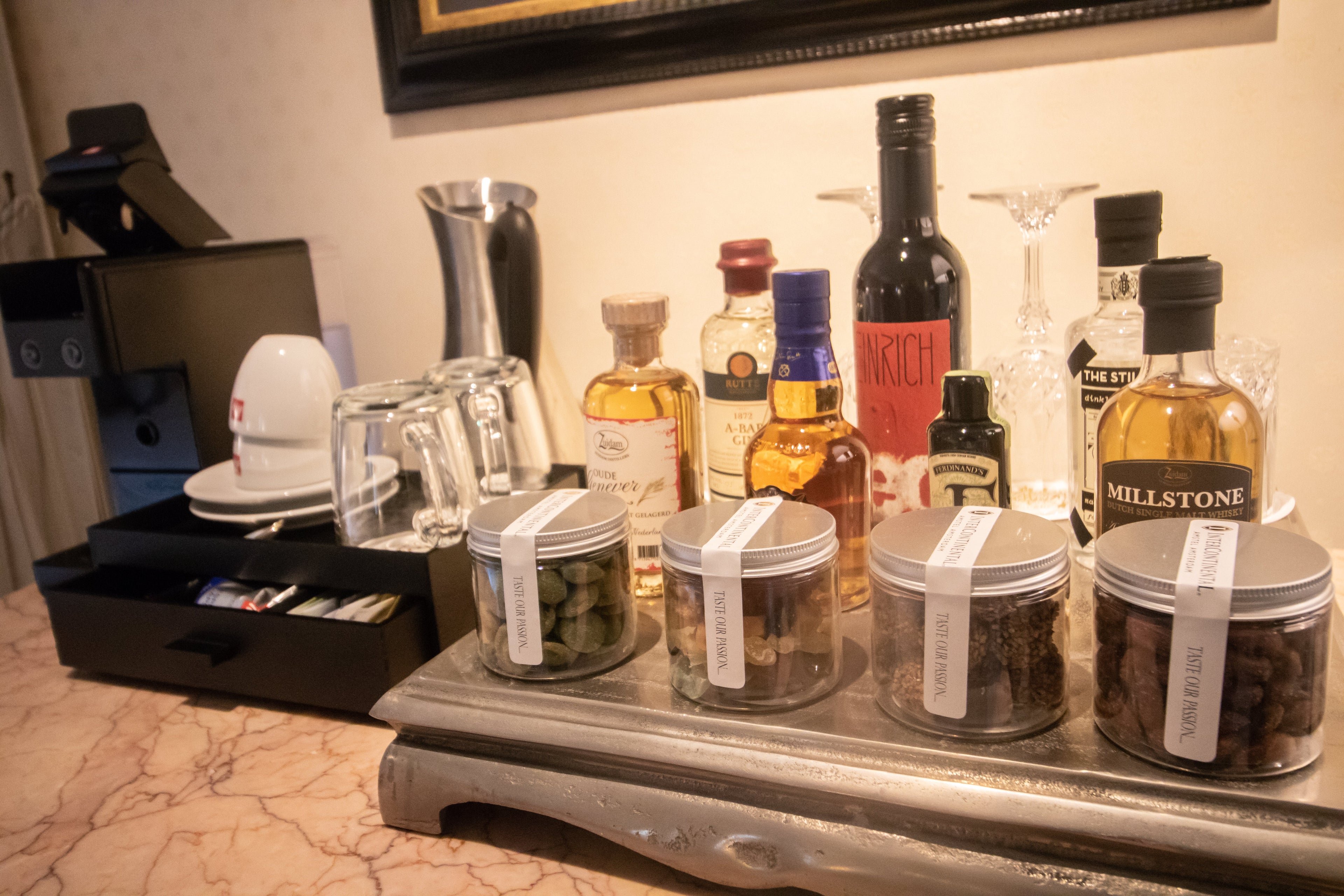 A coffeemaker sat alongside snacks and liquor for purchase.