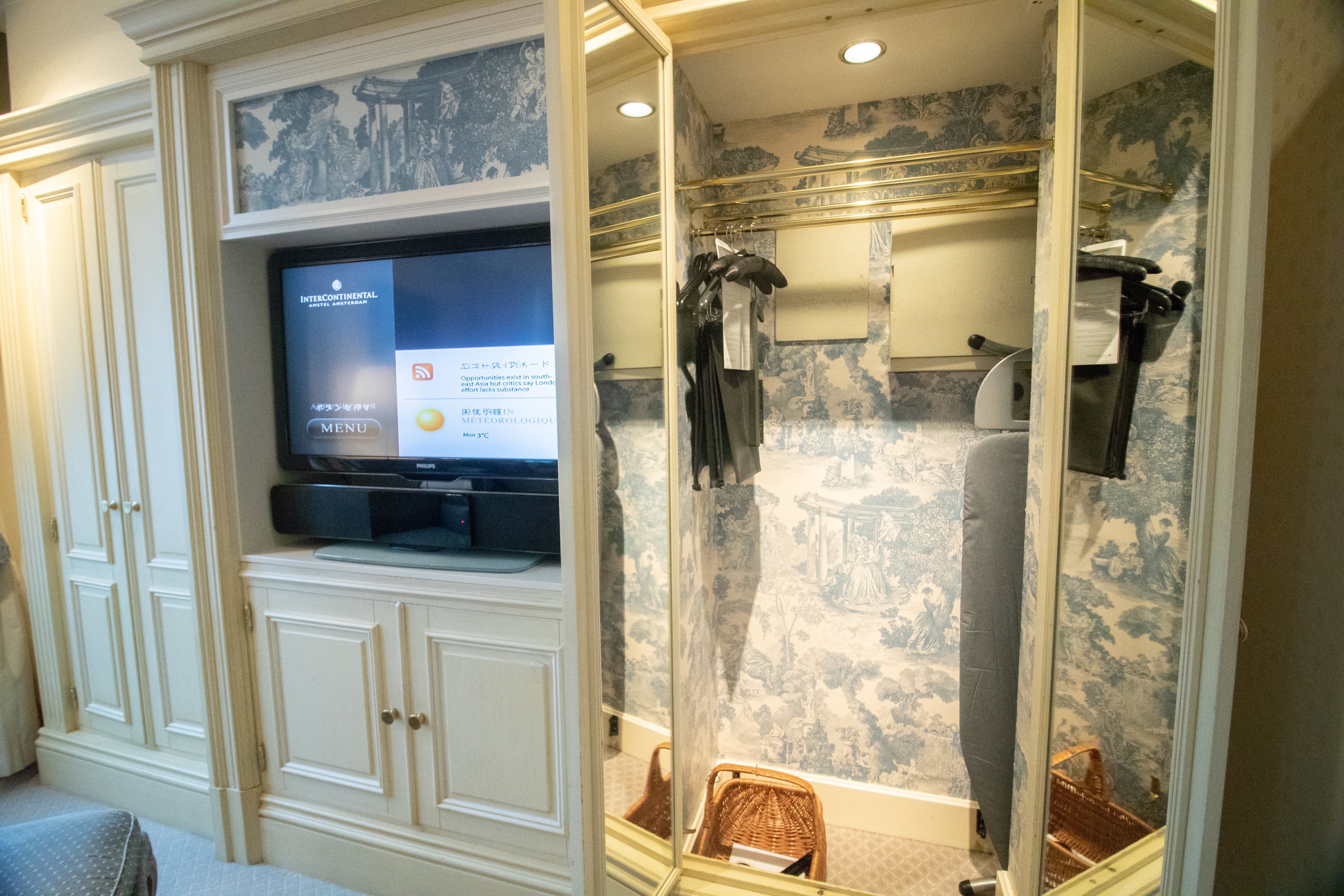 The television was sandwiched between two large closets that had full-length mirrors inside of each of the doors. The closet on the left had a safe and an iron.