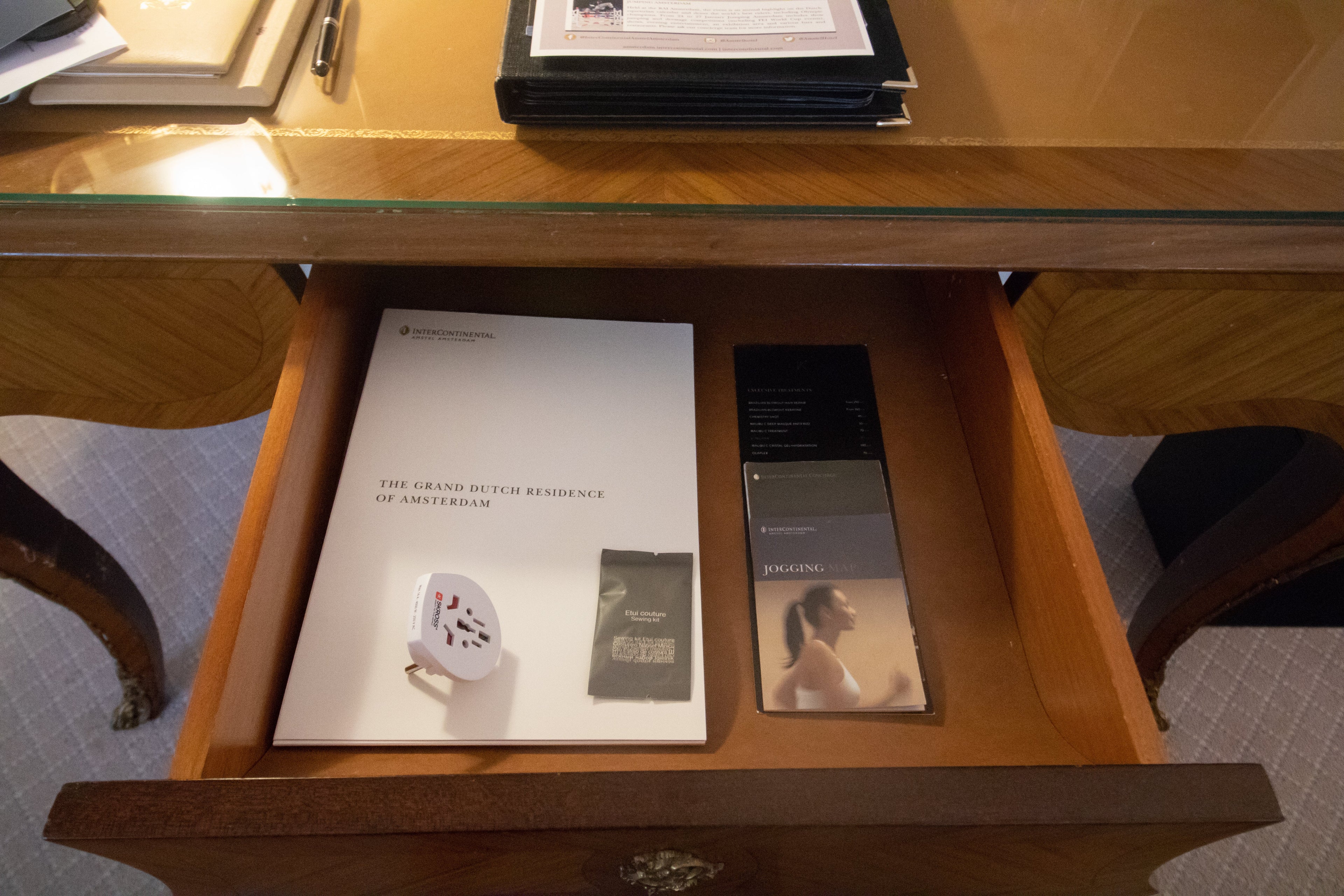 Inside the desk was a jogging map, sewing kit and an international-outlet adapter.