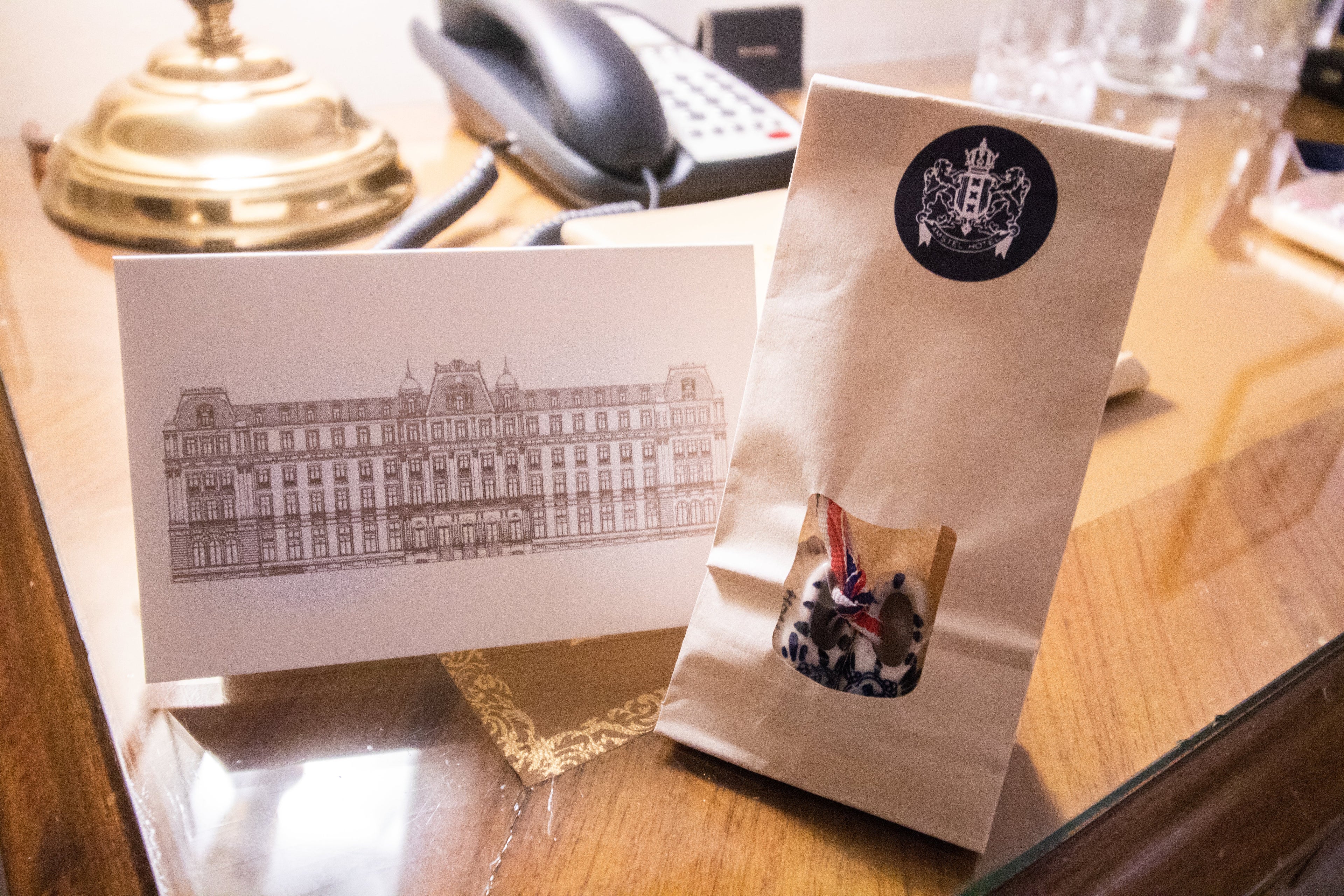 On the desk, I found a handwritten note from the hotel manager and a tiny pair of porcelain clogs with a bow. I collect Christmas ornaments when I travel, so I was really excited about this little gift!