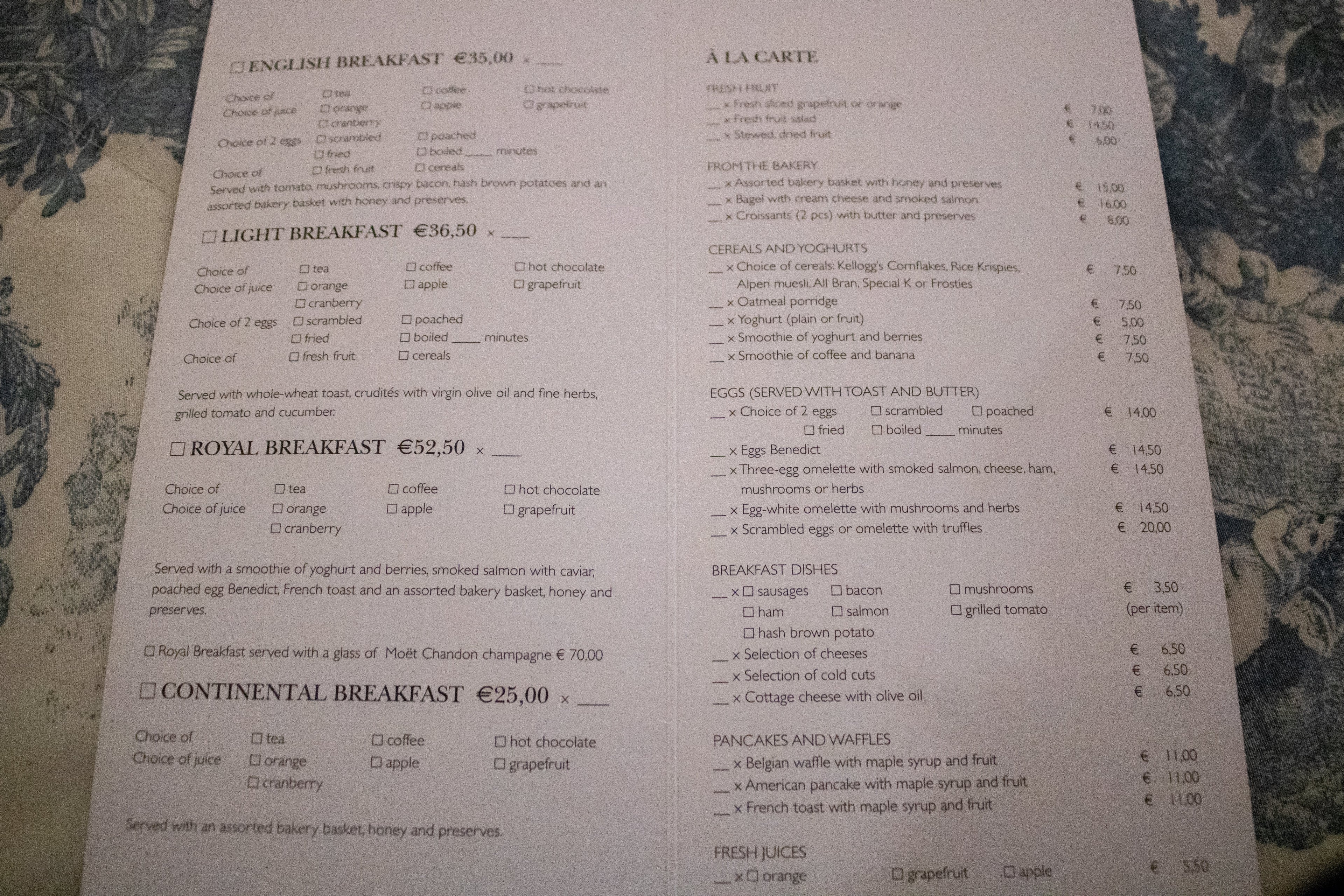 In true TPG fashion, I had to go with the caviar option. We ordered the 52.50 euro ($60) Royal Breakfast for the following morning. I checked off the option, requested a 10:15am breakfast time and hung the menu on the front door.