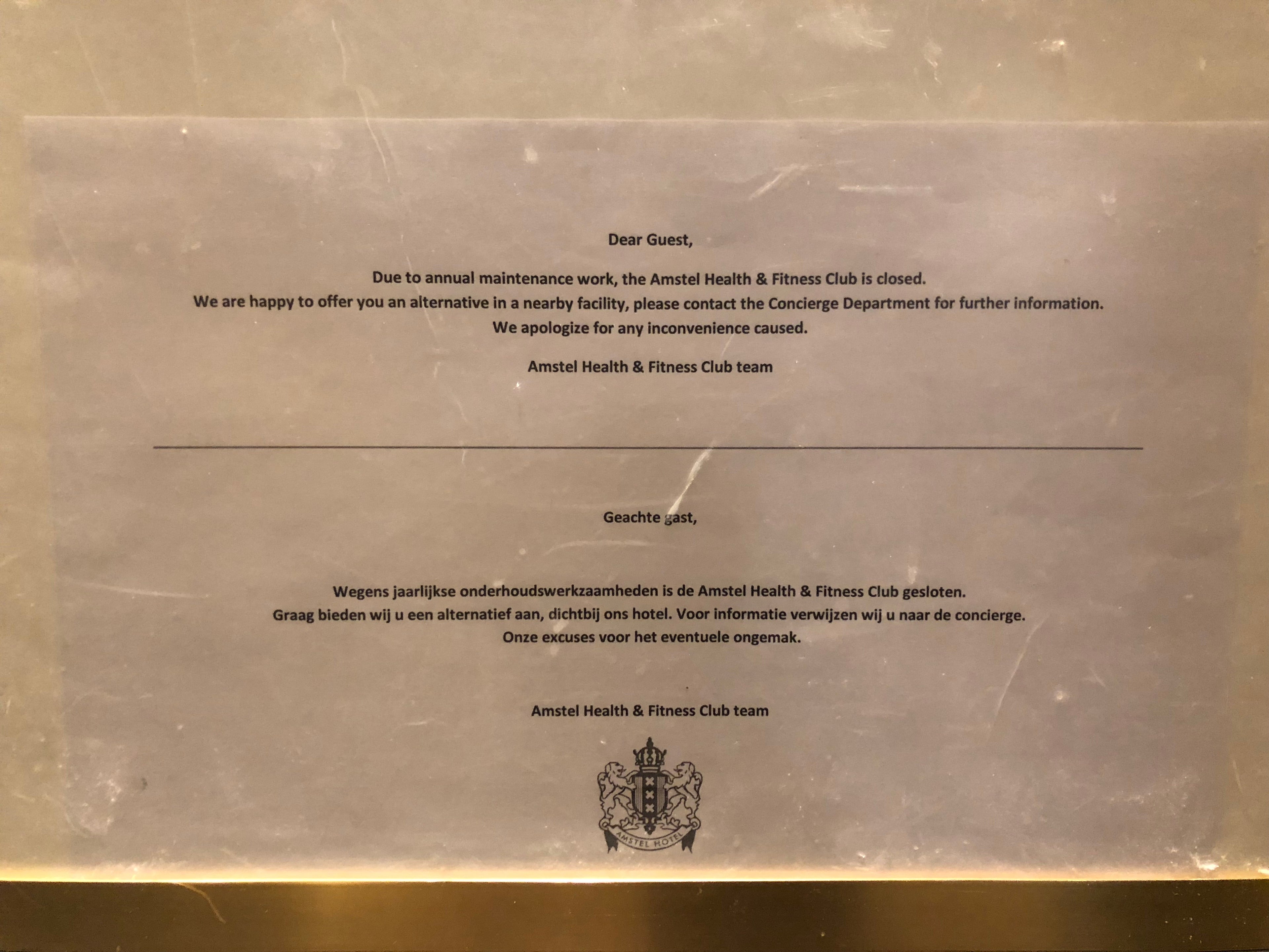 Well, let's start with the negative first. I was eager to see the pool, because I saw beautiful photos of it on the website. I took the elevator to the health and fitness club, and I was greeted by this sign as soon as the elevator doors slid open.