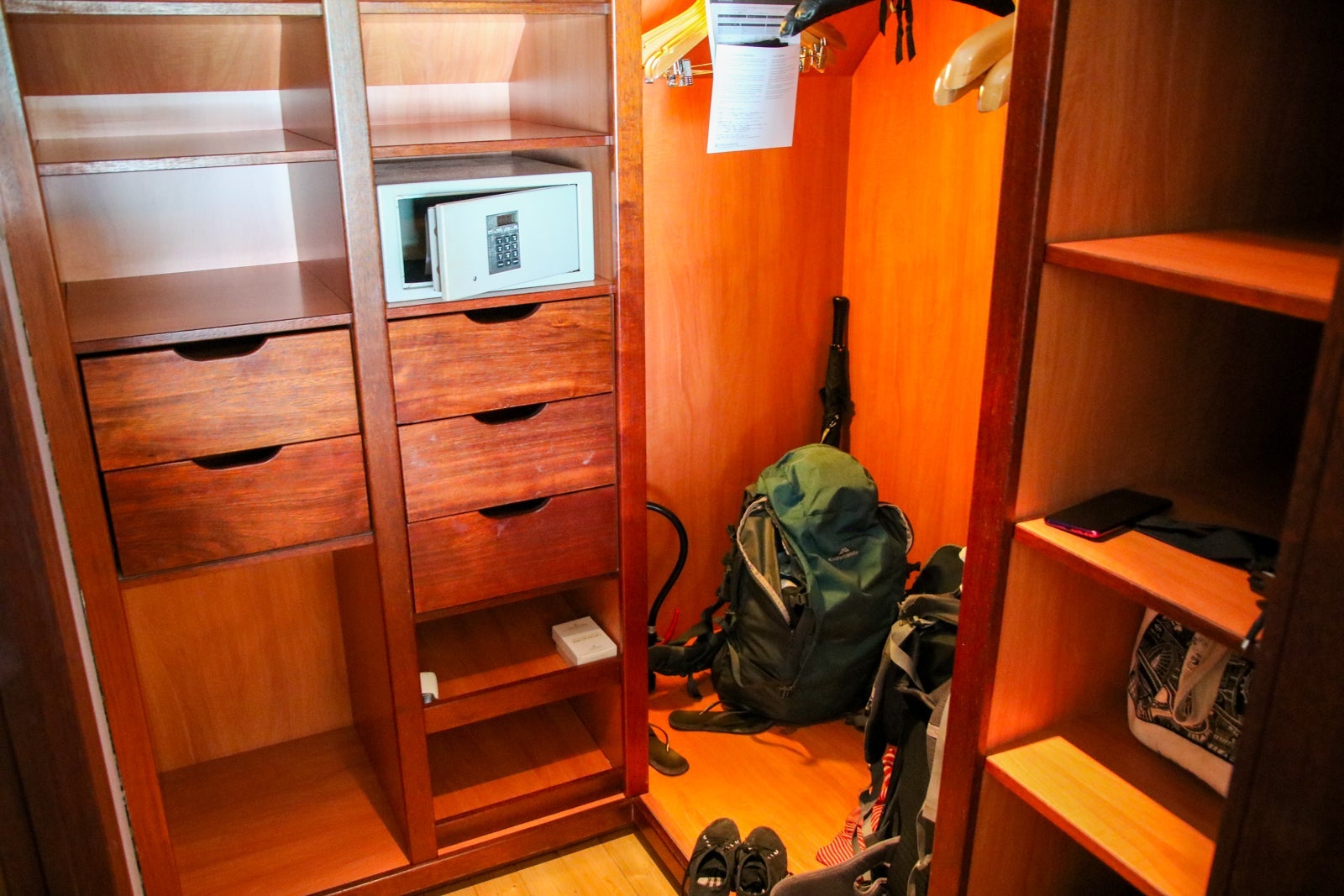 Behind the bed was a walk-in closet with plenty of shelving and a few amenities.