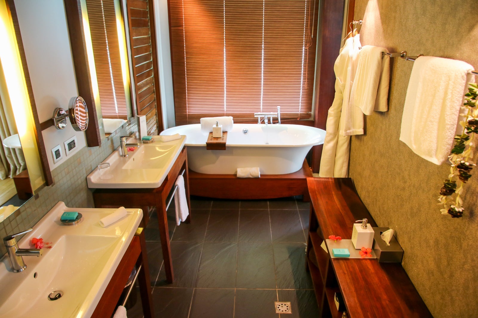 Next to the bedroom was the impressive bathroom with a shower room, two full vanities and a bathtub.