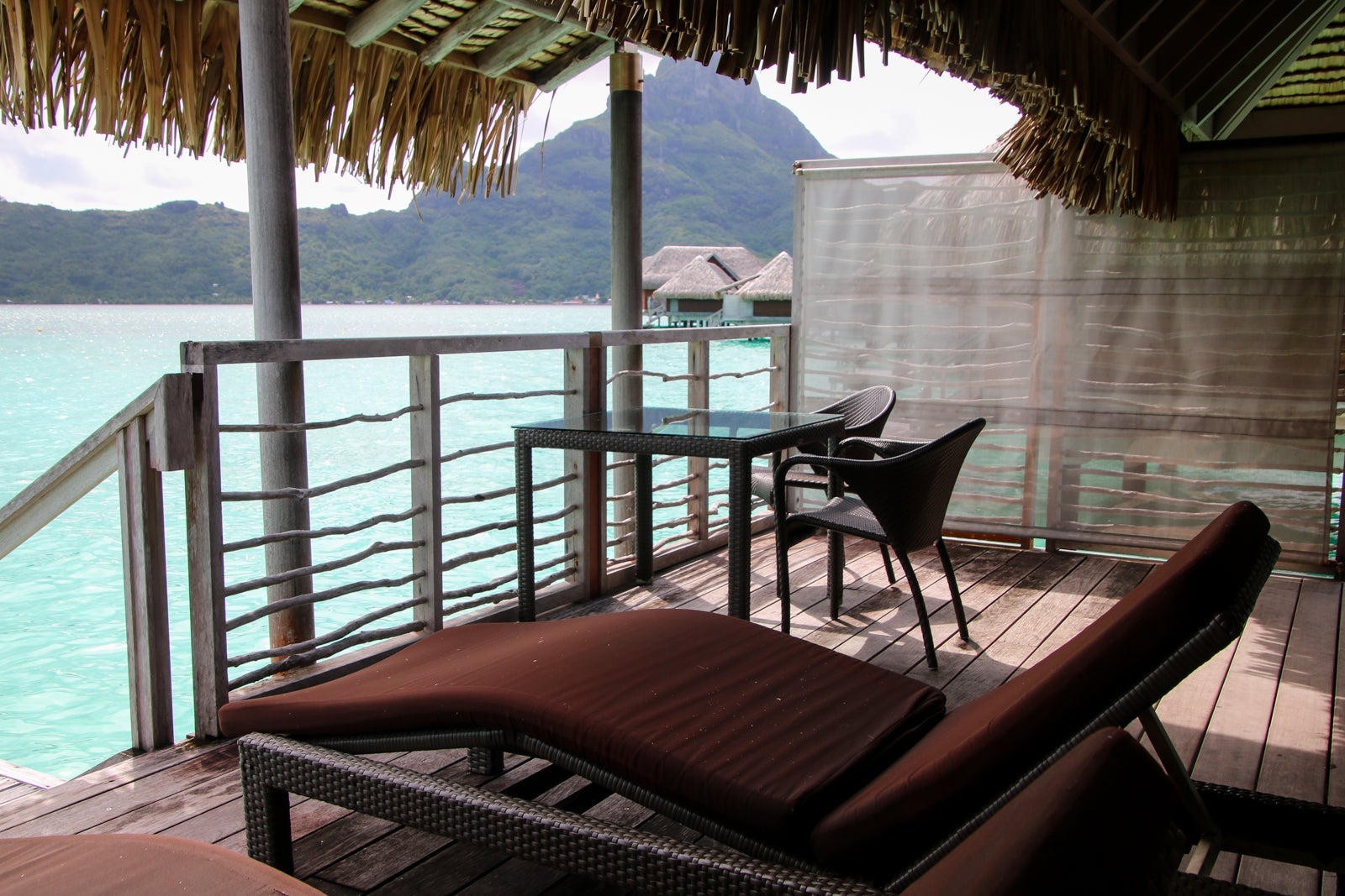 The Thalasso has four categories of one-bedroom overwater villas -- Emerald, Sapphire, Diamond and Diamond Otemanu. All are exactly the same inside; only the view is different. Emerald villas look back to the resort and motu. The other three face the main island with progressively better views of the mountain from Sapphire to Diamond to Diamond Otemanu.
