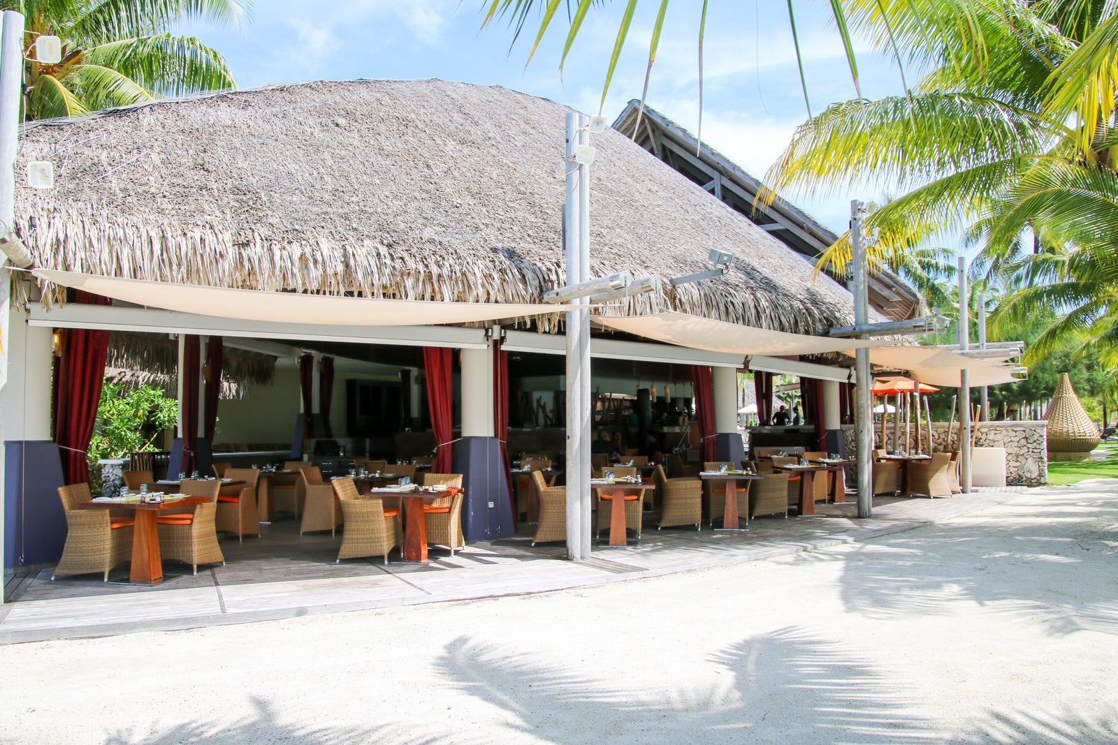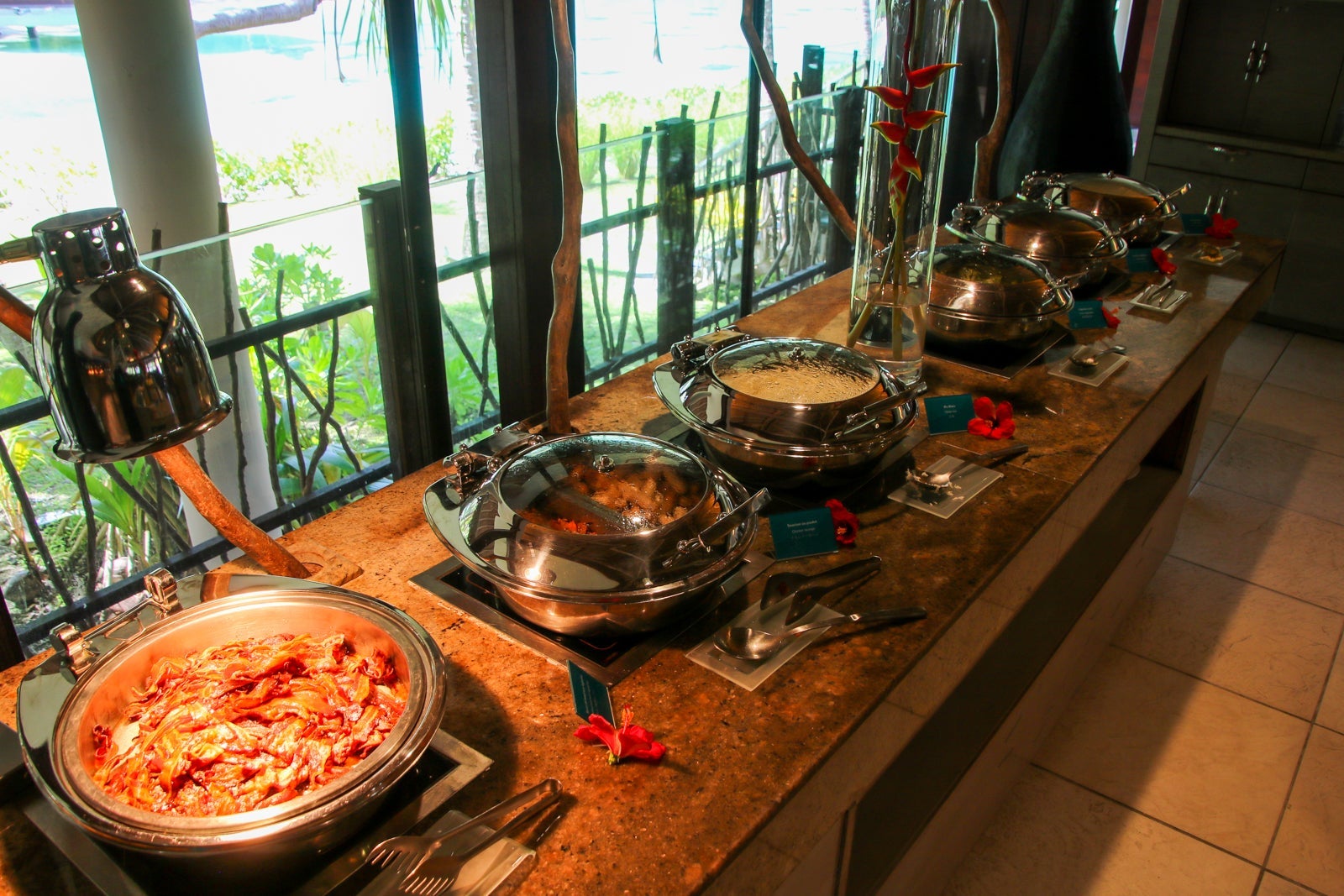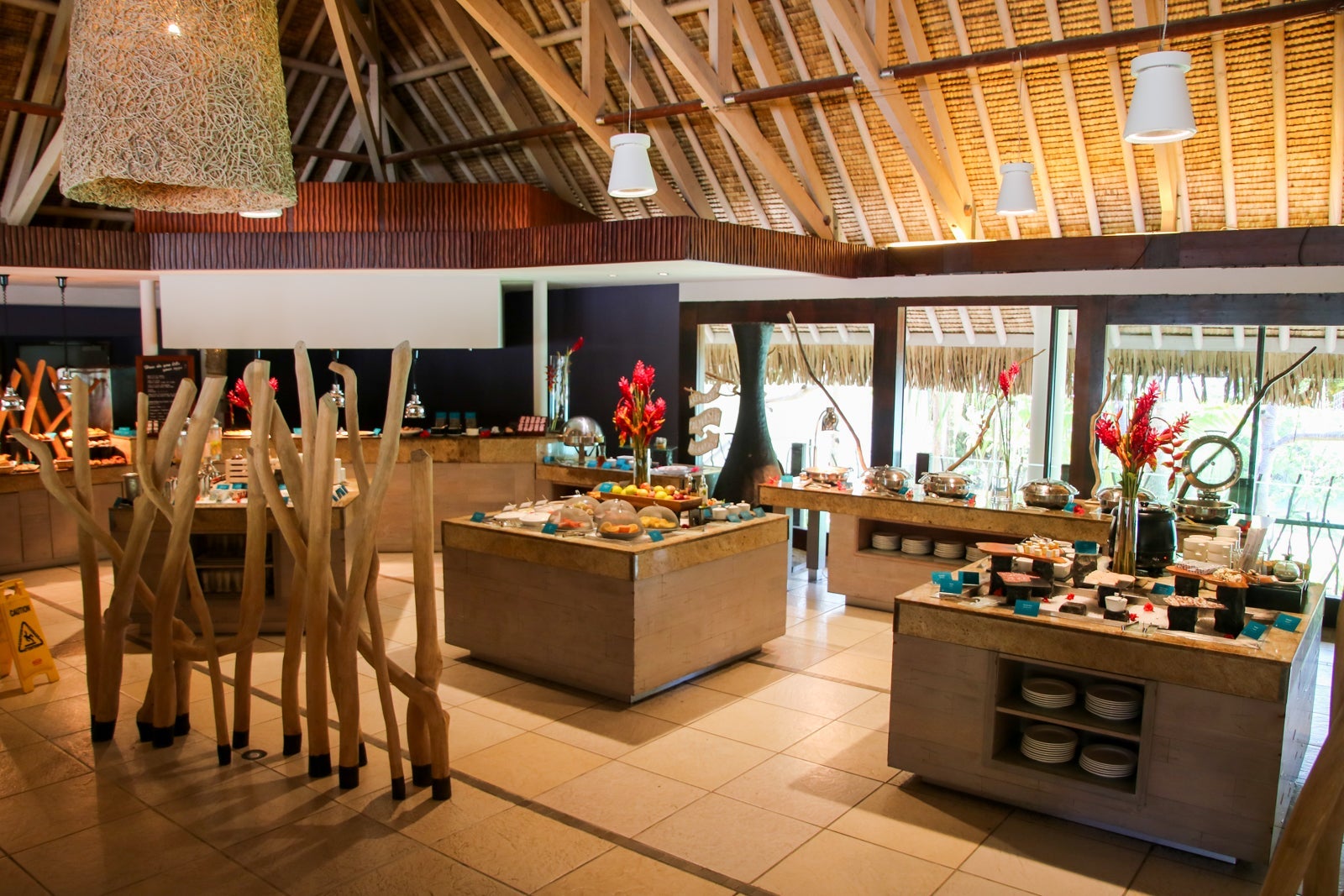 The breakfast buffet was served in the Reef restaurant. During the day, the Sands restaurant served lunch and opened to the beach and lagoon.
