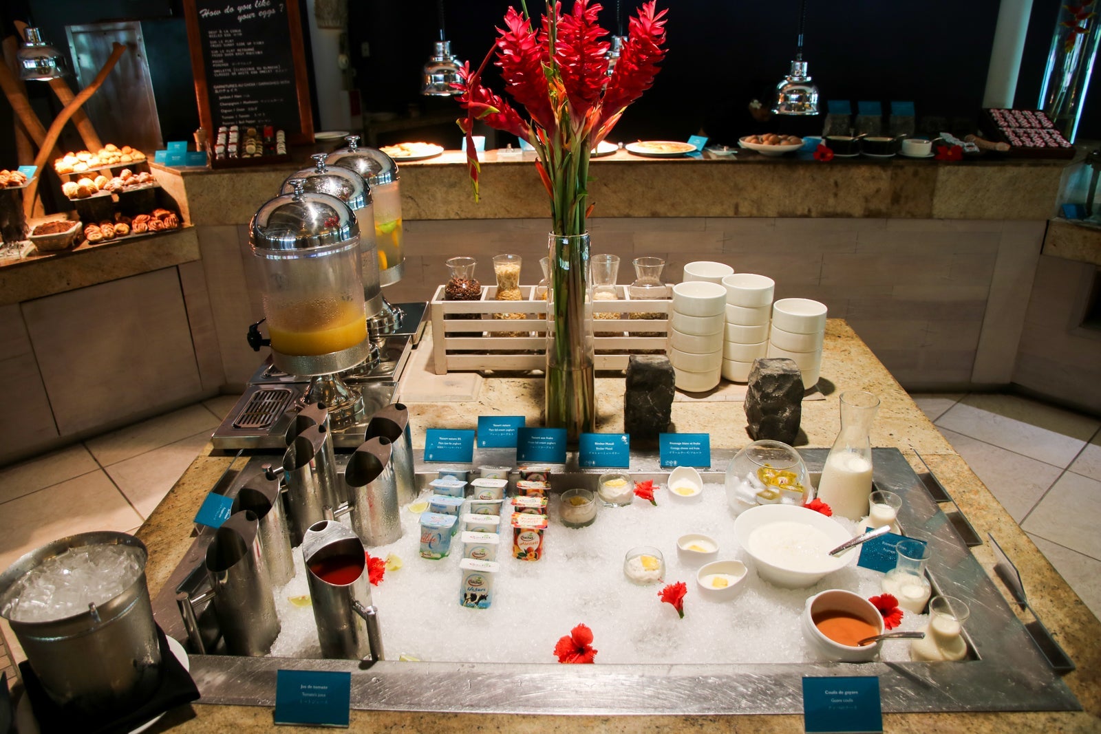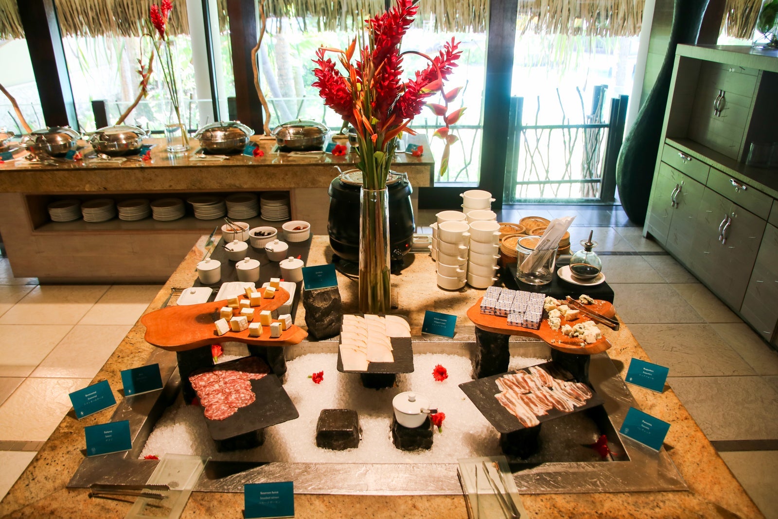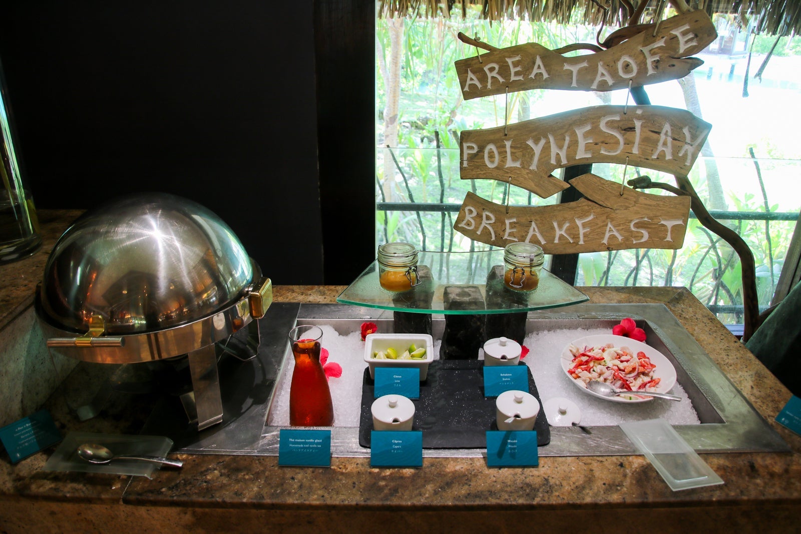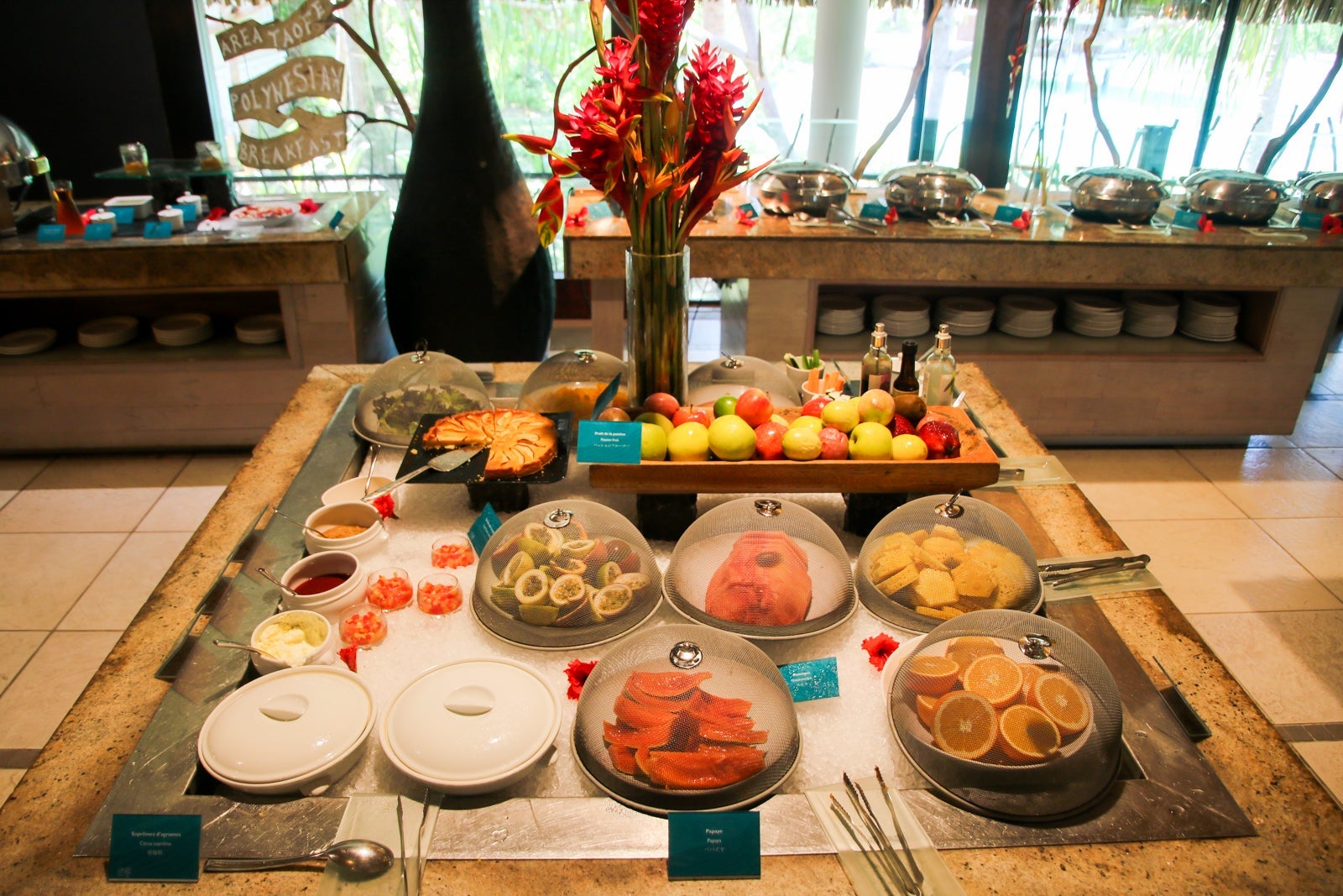 The breakfast buffet was served in the Reef restaurant. During the day, the Sands restaurant served lunch and opened to the beach and lagoon.