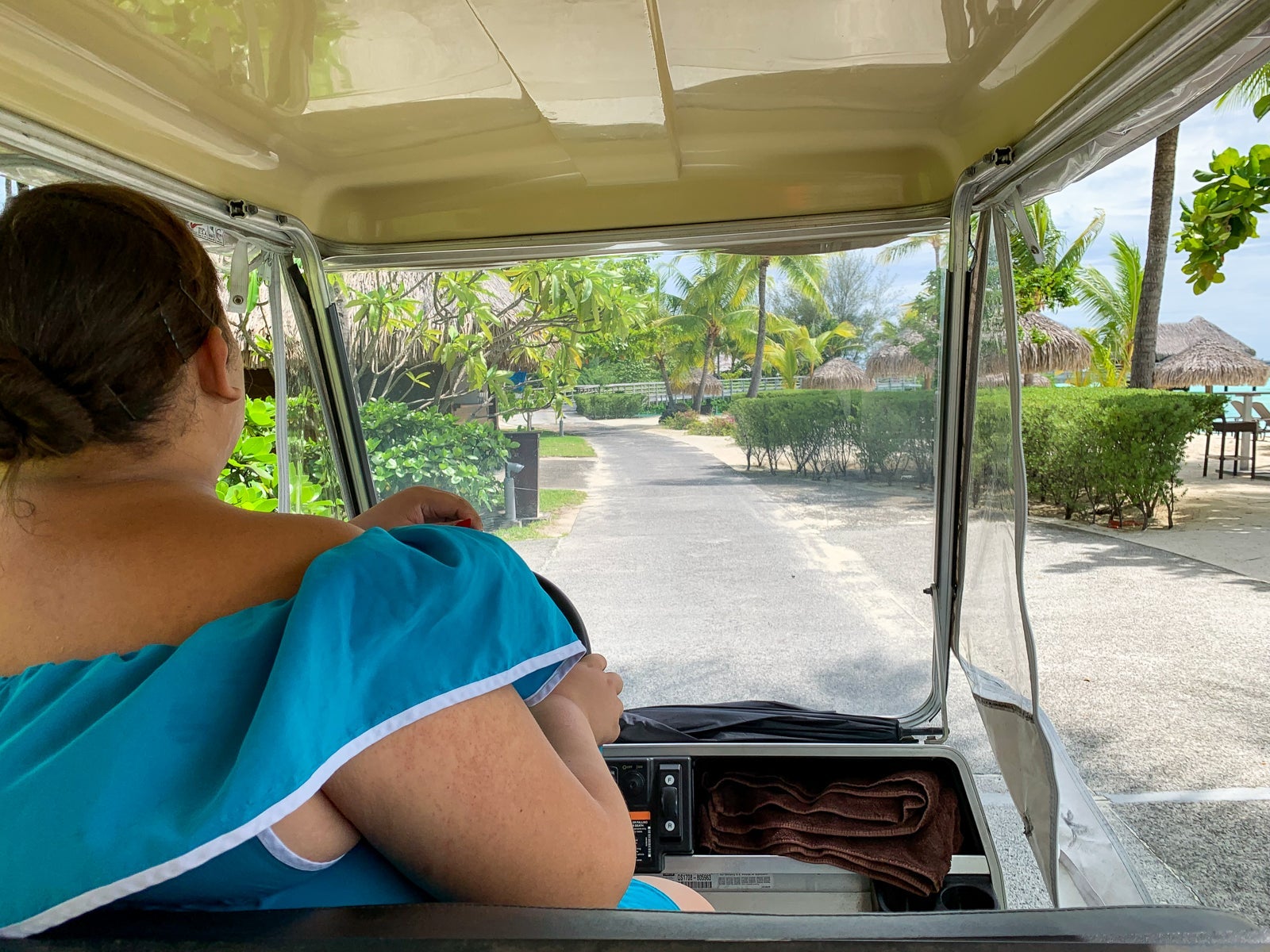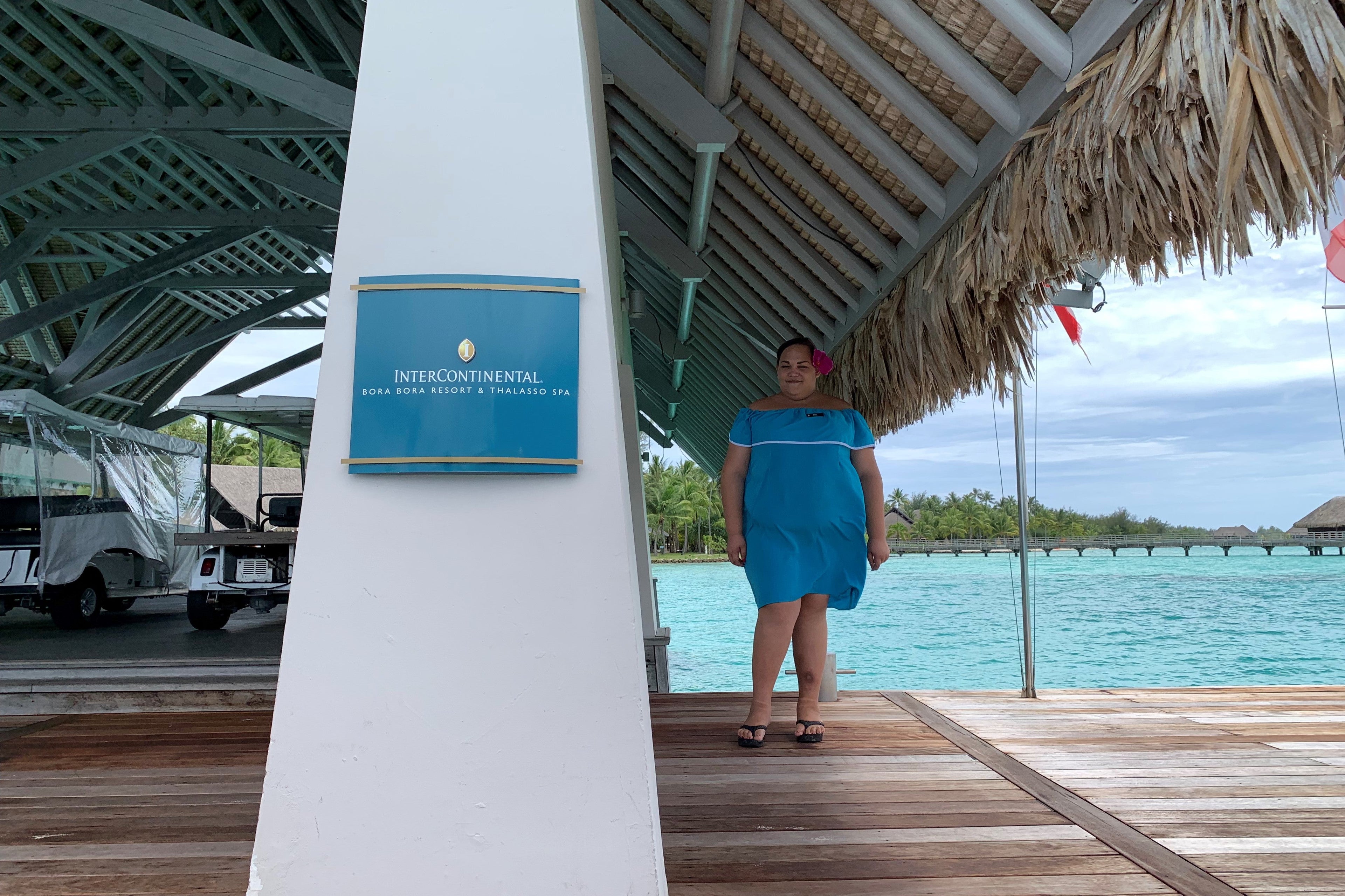 We were greeted at the boat dock by two golf carts. One was driven by a bellhop who took all of our bags and drove them directly to our bungalow. The other by a woman who escorted us to the check-in desk.
