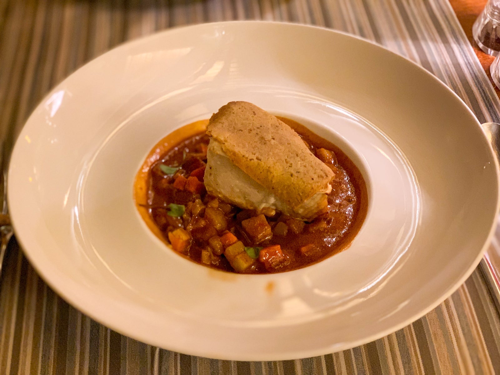 My main course of wahoo fish ($34) crusted with garlic breading and served on a vegetable fish soup did not disappoint.