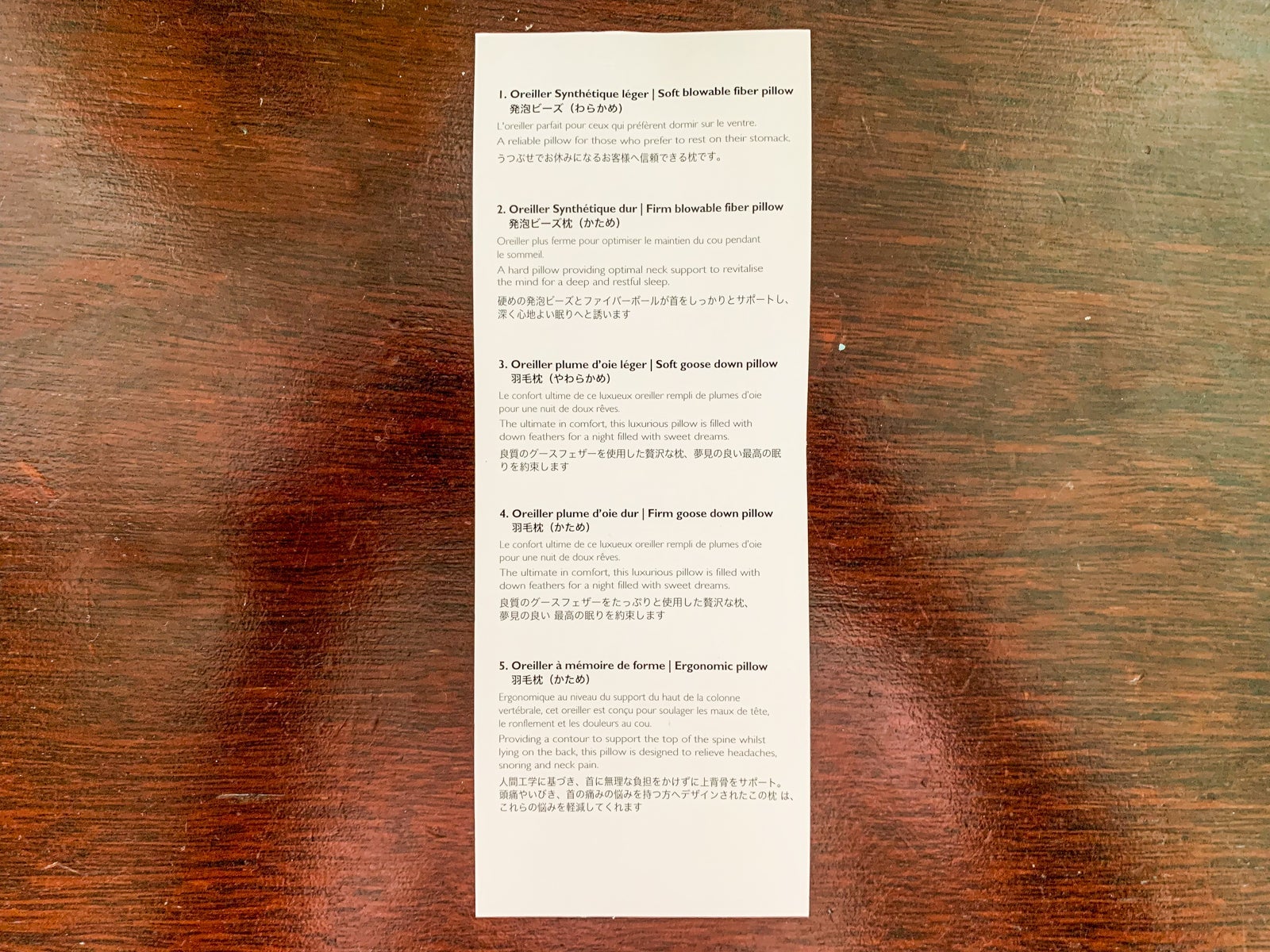 The room even came with a pillow menu, though I somehow didn't see it until our last day. We tried the soft goose down and firm goose down pillows. I honestly couldn't tell them apart from any other pillow, but all were comfy.