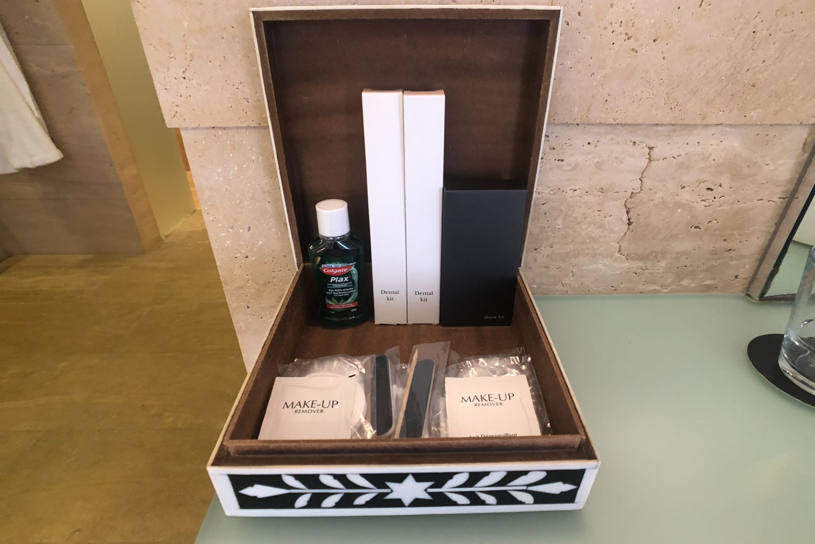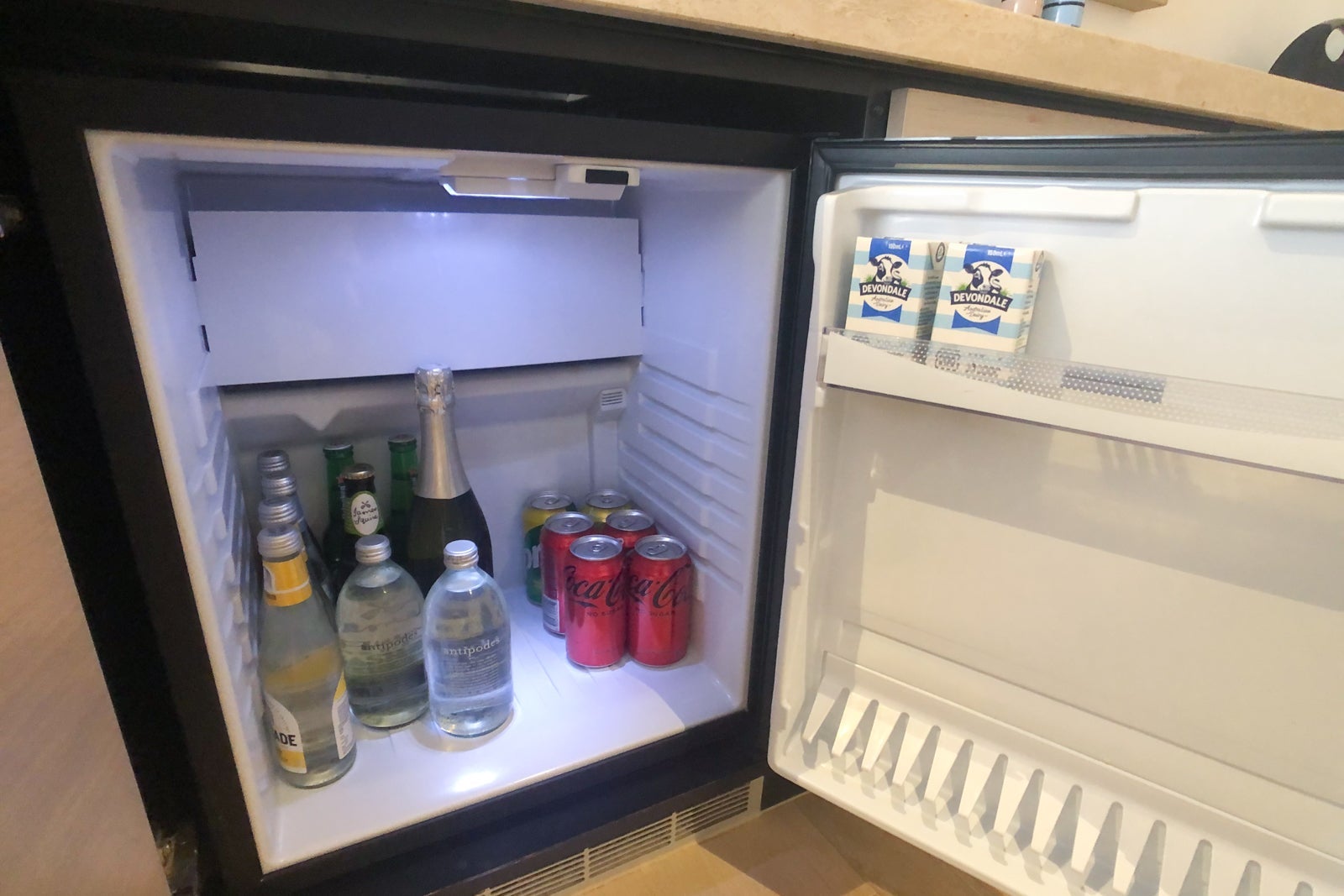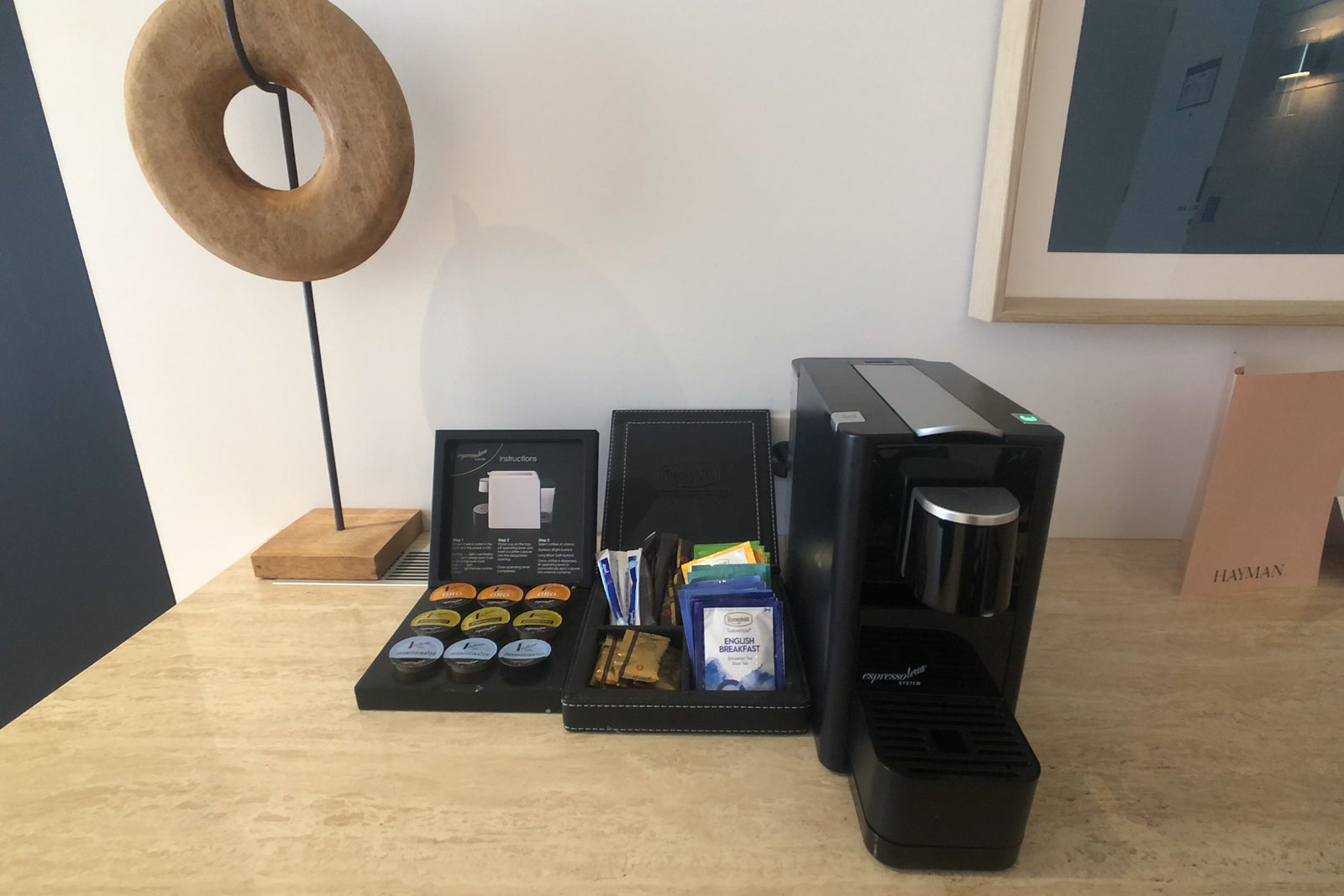 The credenza along the wall held some other amenities: two water bottles to use at the resort, hand sanitizer, alcohol wipes and face masks. Non-pandemic items included an espresso maker and Vittoria coffee pods, a Harman/Kardon Bluetooth speaker, a tablet that you could use to search the resort's various offerings and the mini-fridge, which was stocked with a variety of cold beverages.