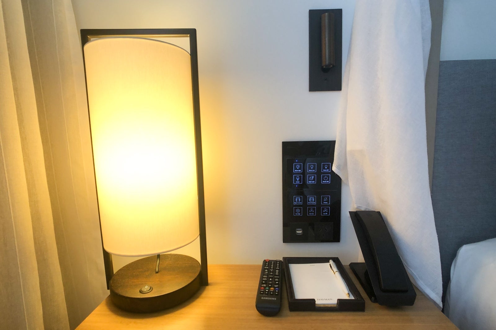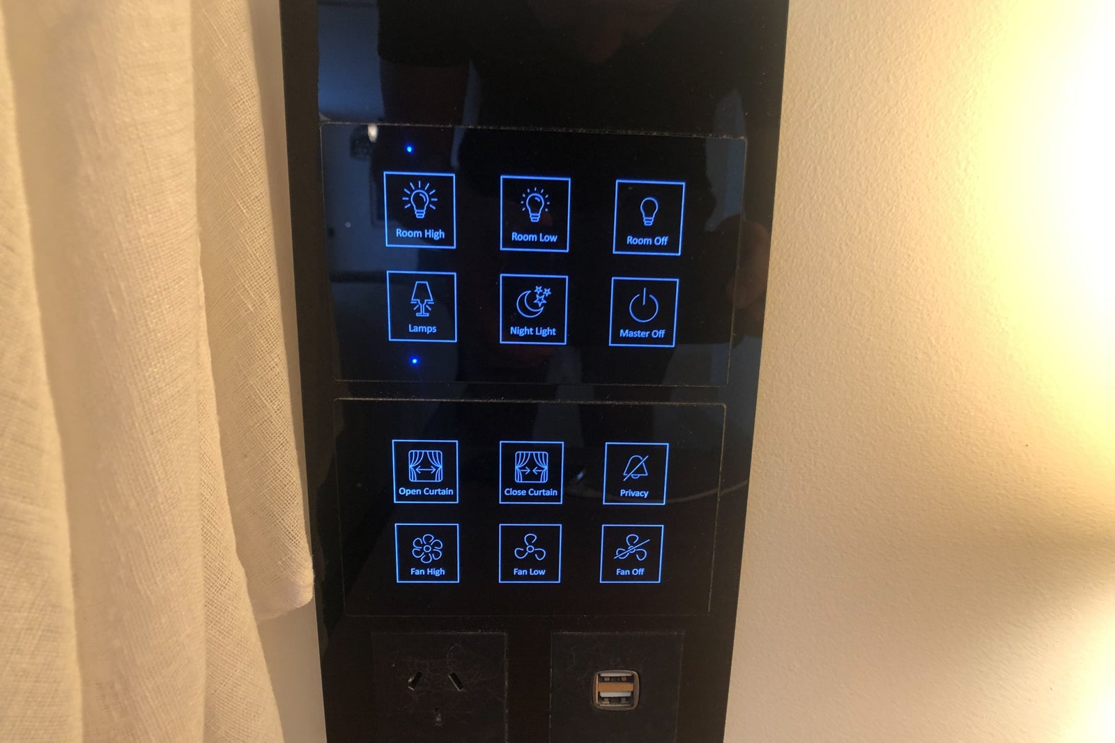 To either side were nightstands with lantern-like lamps, small reading lights, a telephone (on one side) and a panel of buttons to control the lighting and shades on the wall. Another large wall-mounted flatscreen TV was located to the right of the arch on the wall opposite the bed.