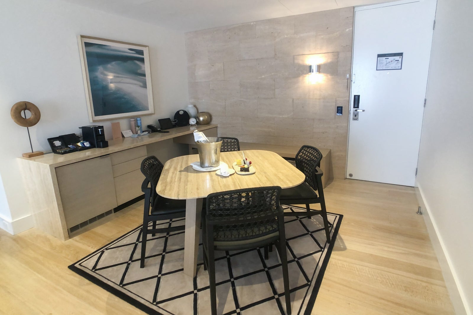 The door opened right into the main living room of the suite. There was a low bench to the right of it where you could drop your towels and shoes after a day at the pool or on the beach. The room also included a four-person dining table, upon which I found a welcome amenity of petit fours and a bottle of sparkling wine.