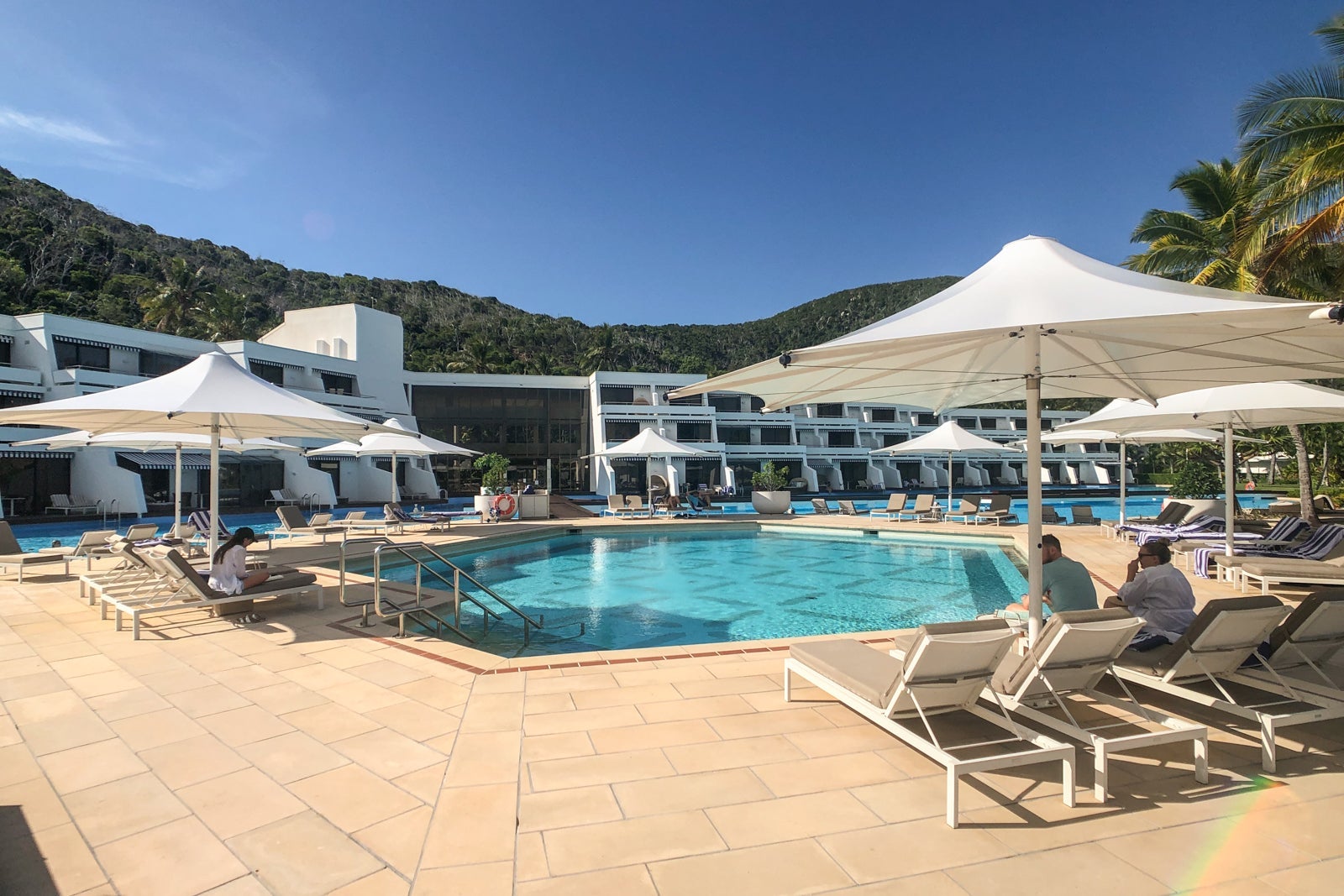 By the Lagoon Wing, an infinity pool runs along the beach and then another arm of it extends perpendicularly toward the hotel buildings. Loungers encircle the pool and dot the nearby lawn. There are also a few different cabana-like daybeds. This area tended to be quieter since it was mostly adults.