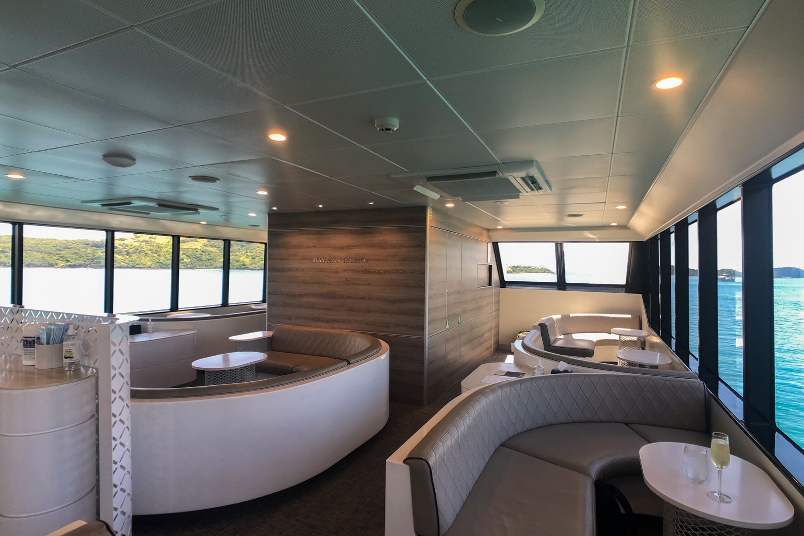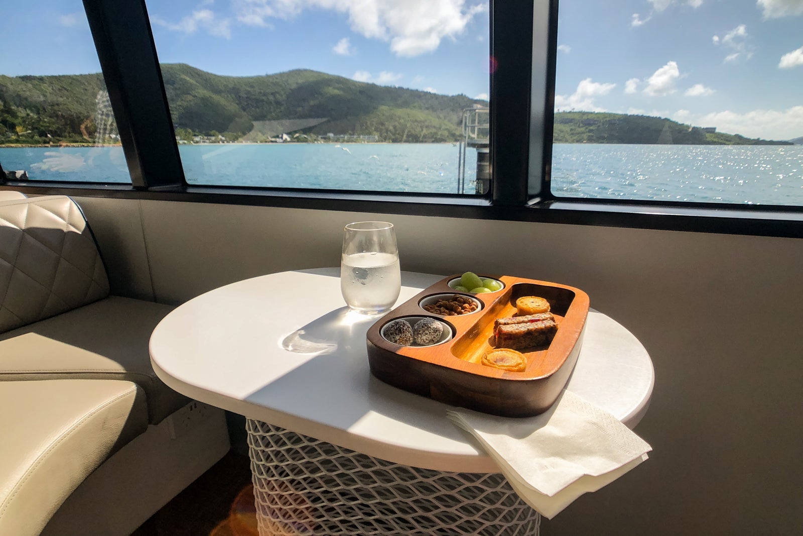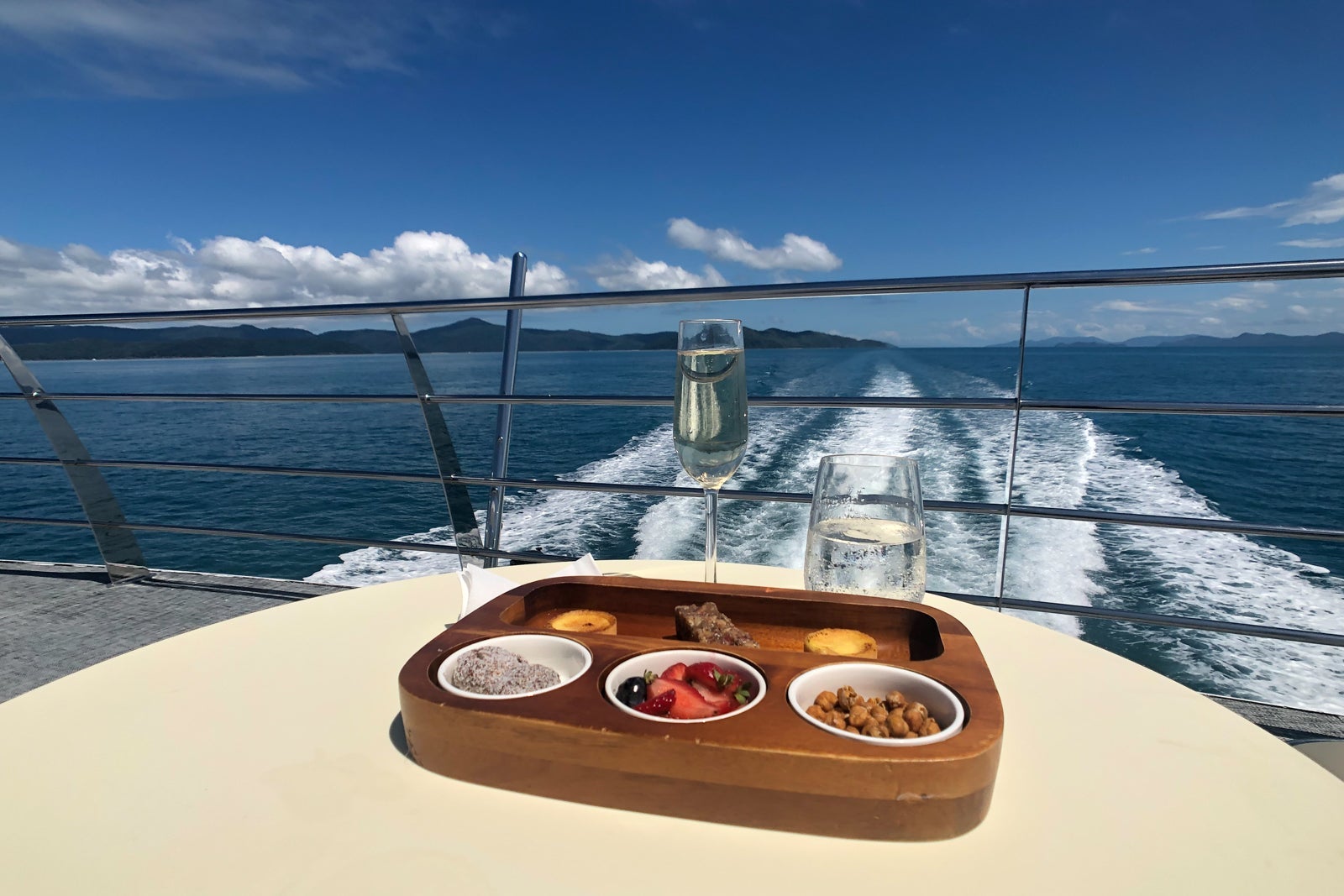 I just went with the regular round-trip transfer on the resort's yacht. On the way out, I had it all to myself, while on the way back, I shared it with a few other couples flying out the same day. On my afternoon outbound, I was treated to Bimbadgen sparkling wine from the Hunter Valley along with an assortment of fruits and other snacks presented on a simple wooden tray. The morning return included a service of water and orange juice along with the same snacks.