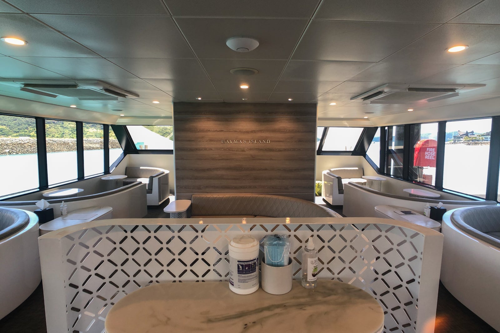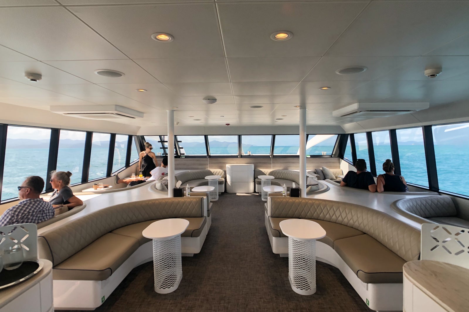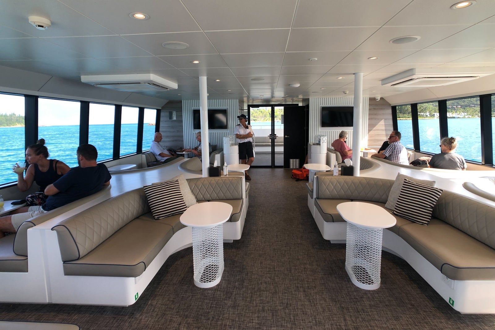 I just went with the regular round-trip transfer on the resort's yacht. On the way out, I had it all to myself, while on the way back, I shared it with a few other couples flying out the same day. On my afternoon outbound, I was treated to Bimbadgen sparkling wine from the Hunter Valley along with an assortment of fruits and other snacks presented on a simple wooden tray. The morning return included a service of water and orange juice along with the same snacks.