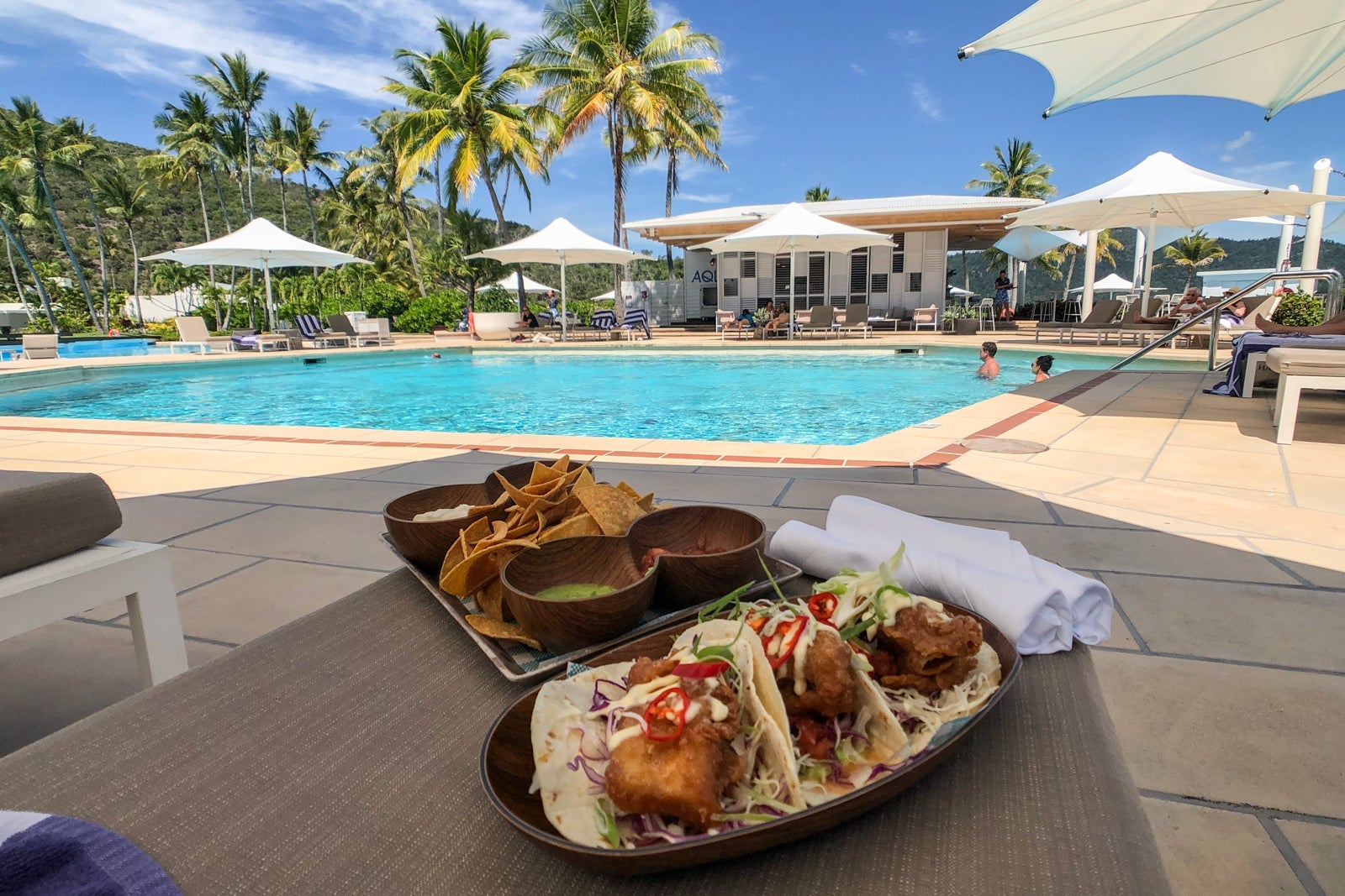 Near the larger pool, Aqua serves food and drinks throughout much of the afternoon. I ordered the Baja-style fried fish soft tacos with cabbage and cilantro-lime dressing (AU$28 - $21). They were enormous and more than enough to share between two people. That said, I also got the chips with guacamole and salsa for AU$21 ($16), which was a mistake since everything tasted like it had come out of jars from the supermarket.